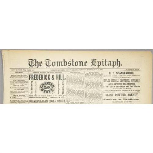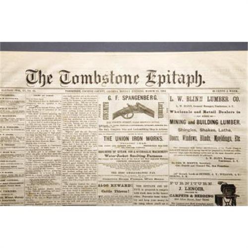 <B>LOT OF (5) “THE TOMBSTONE EPITAPH” ARIZONA NEWSPAPERS 1882 </B></I> - Tombstone, Cochise County Arizona. This lot consists of 5 different newspapers pertaining to the Famous Tombstone, Arizona Territory. Two have vignettes of Stagecoaches. “Arizona Mail & Stage Line”, four have vignettes of shotguns & two have $500. Reward by Sheriff John H. Behan. News of the day, ads, Etc. <BR><BR><B>Condition: </B></I>Poor-good<BR><BR><b>Shipping:</b> Flat Material, Large (<a target="_blank" href="http://www.heritageauctions.com/common/shipping.php">view shipping information</a>)