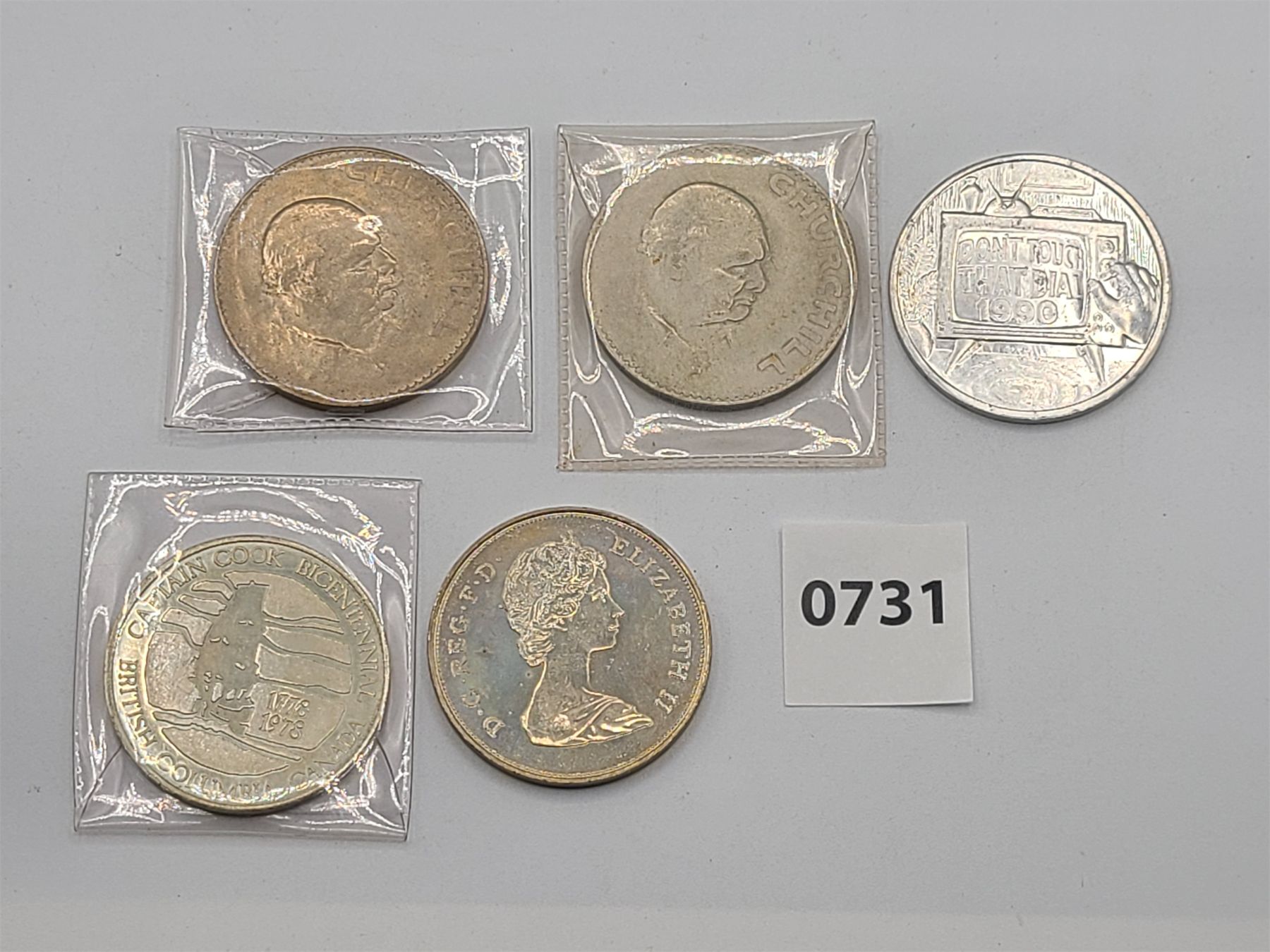 LOT OF 5 - TOKENS - WINSTON CHURCHILL CROWN, 1981 ROYAL WEDDING, MARDI GRAS, ETC.