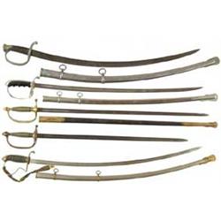 LOT OF 5 U.S. SWORDS. 1) Unmarked artillery hanger with 321/2" curved blade, wide fuller, nickeled brass knuckle bow, ball cross guard, nickeled iron scabbard that does not quite fit.-Good. 2) Horstmann U.S. marked NCO sword without scabbard.-Good. 3) Unmarked musician sword with iron scabbard and brass trim.-Very good. 4) Ridabock late officer’s sword with etched blade and original scabbard, D-guard knuckle bow with wire wrapped fish skin handle, nickel scabbard.-Very good. 5) Horstmann inscribed sword, post war issue, etched blade with the name “F.C. Berry". Three branch hand guard with gutta percha handle, etched blade with nickel scabbard.-Extremely fine. 4-49241-580 JR531