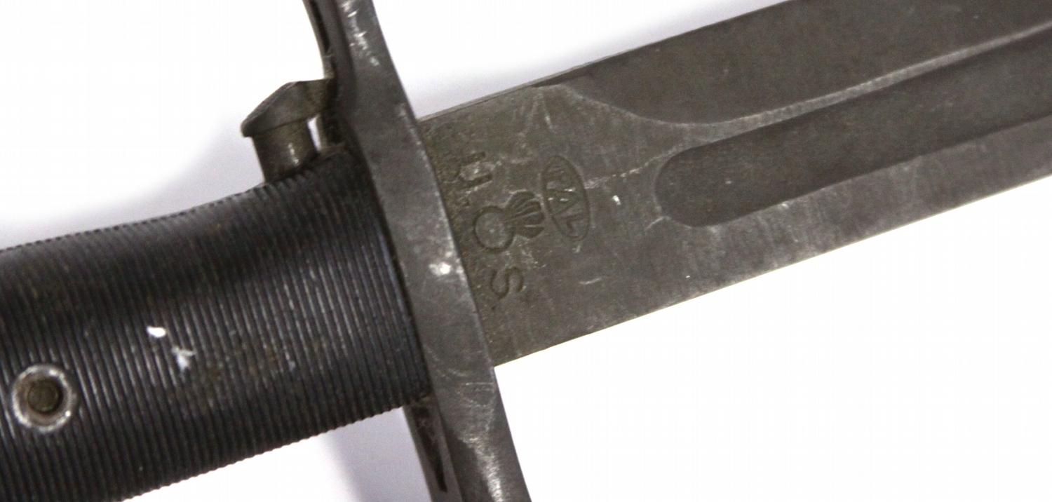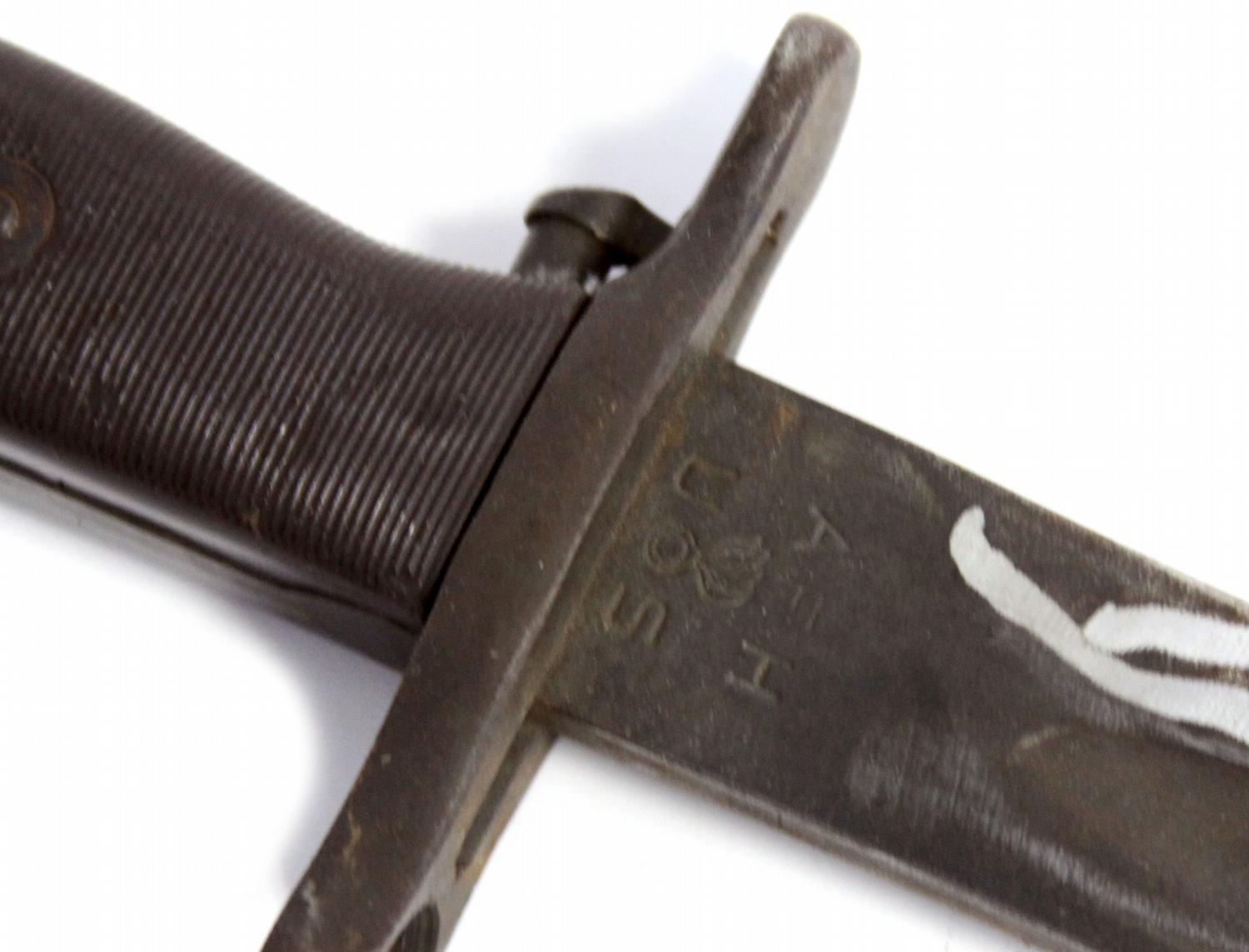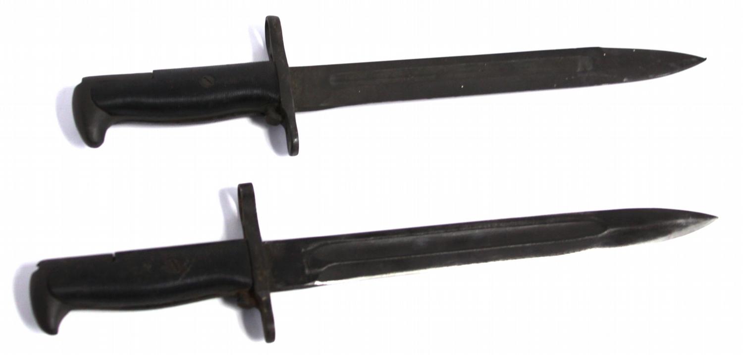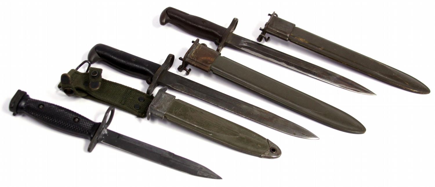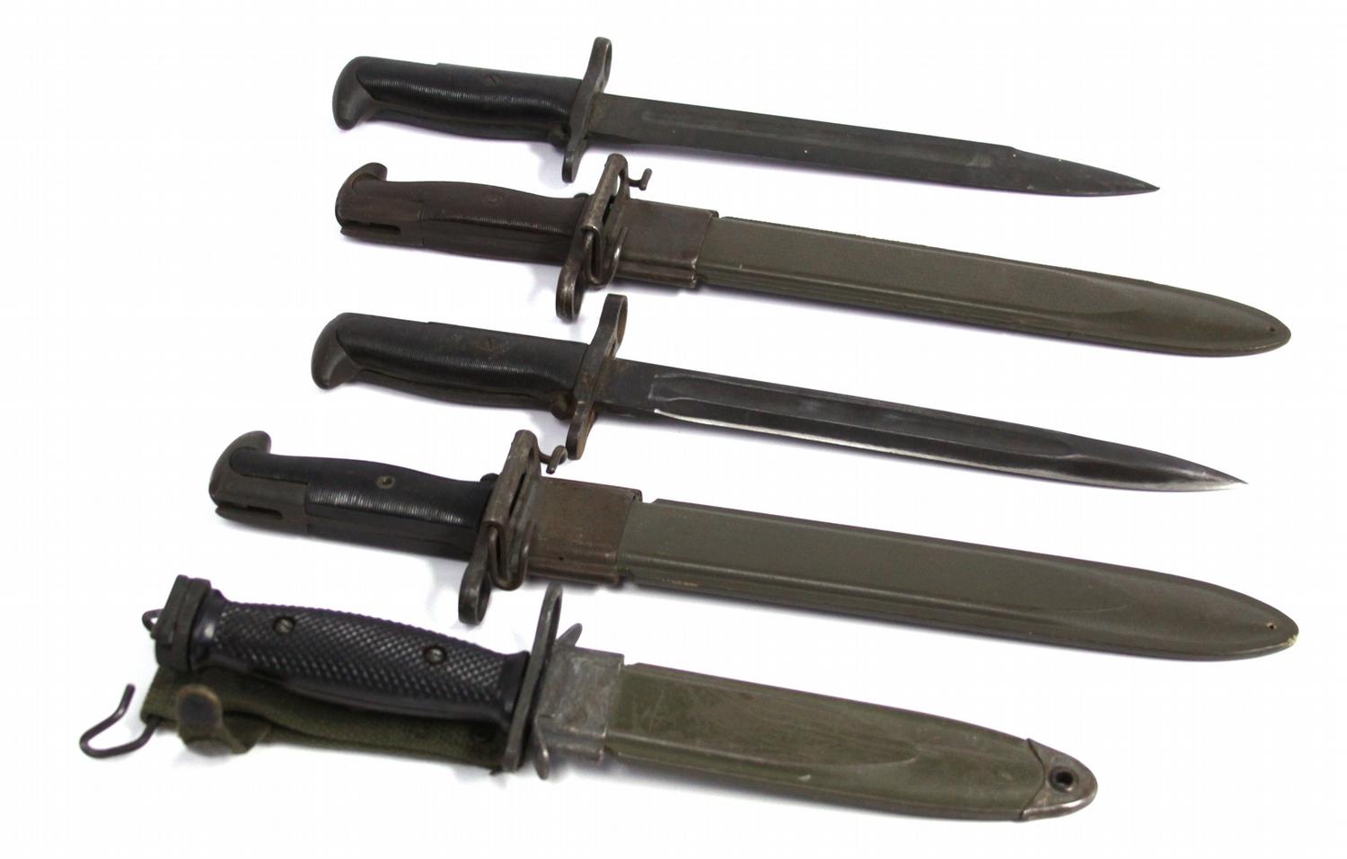 Lot of five US issue bayonets. Descriptios as follows: M1 Garand marked "PAL", with no scabbard, good condition; M1 Garand bayonet marked "AFH / US / 1942" with ordinance mark, in scabbard, very good condition; Garand bayonet marked "AFH / US", heavy sharpening marks on blade, with scabbard; Garand marked "UFH / US, no scabbard; M7 bayonet, in excellent condition with scabbard.