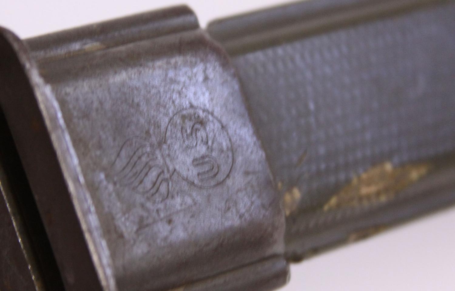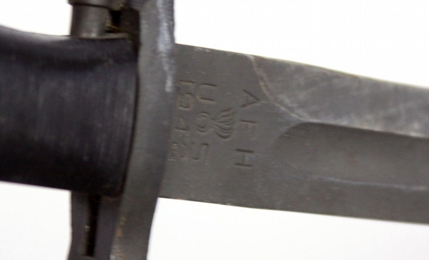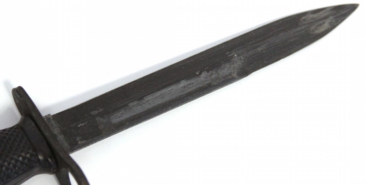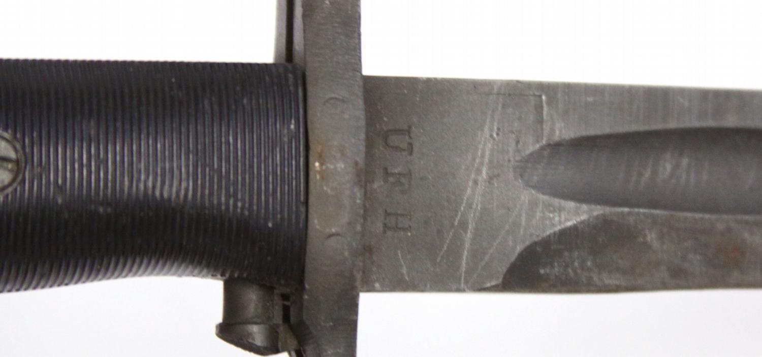 Lot of five US issue bayonets. Descriptios as follows: M1 Garand marked "PAL", with no scabbard, good condition; M1 Garand bayonet marked "AFH / US / 1942" with ordinance mark, in scabbard, very good condition; Garand bayonet marked "AFH / US", heavy sharpening marks on blade, with scabbard; Garand marked "UFH / US, no scabbard; M7 bayonet, in excellent condition with scabbard.