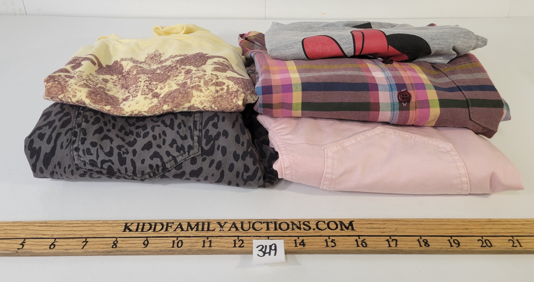 LOT OF 5 - WOMEN'S MINIMUM, INSIGHT & WESC T-SHIRTS, PANTS & DRESS - FT MINNIE MOUSE, TARTAN, ETC
