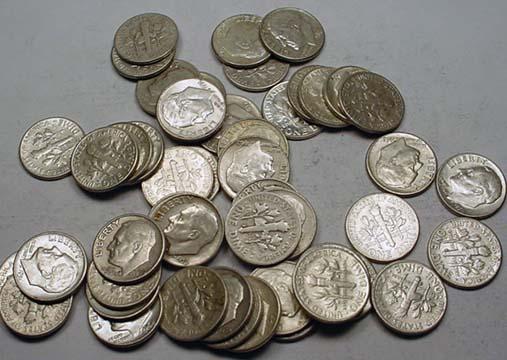 LOT OF 50 90% SILVER ROOSEVELT DIMES - 1964 OR EARLIER - UNSEARCHED!!