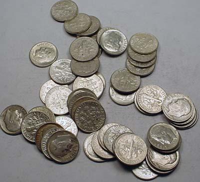 LOT OF 50 90% SILVER ROOSEVELT DIMES - 1964 OR EARLIER - UNSEARCHED!!