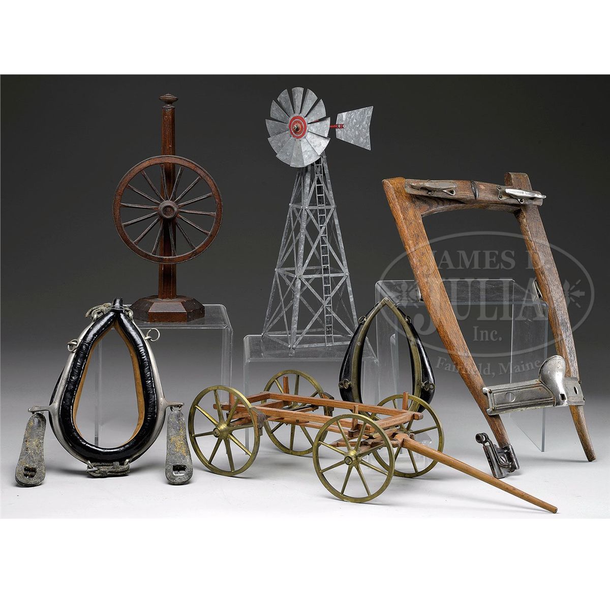 Lot includes 2 leather and nickel horse collars, wagon yoke, brass and wood wagon base, spoke wagon wheel mounted to post and galvanized steel windmill. SIZE: Yoke: 20" l x 11" w. Wagon base: 23" l x 8-1/2" w. CONDITION: Very good with various chips and scratches. One horse collar has significant mildew. 1-13621
