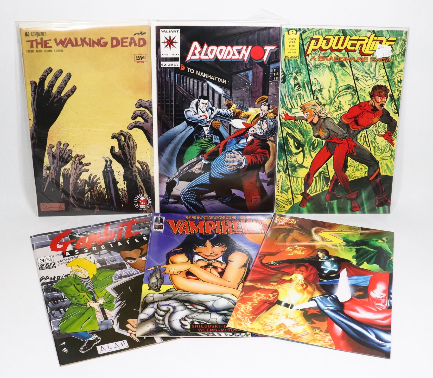 DYNAMITE S #0 POWERLINE A SHADOW SAGA #6 GAMBIT ASSOCIATES #3 BLOODSHOT NO.3 VENGEANCE OF VAMPIRELLA #4THE WALKING DEAD 163:CONQUERED***ITEM(S) LOCATED IN LETHBRIDGE ALBERTA. ALL ITEMS IN THIS AUCTION ARE ELIGIBLE FOR OUR FREE TRANSPORT TO EDMONTON OFFICE SERVICE. WORLDWIDE CANADA POST SHIPPING IS AVAILABLE