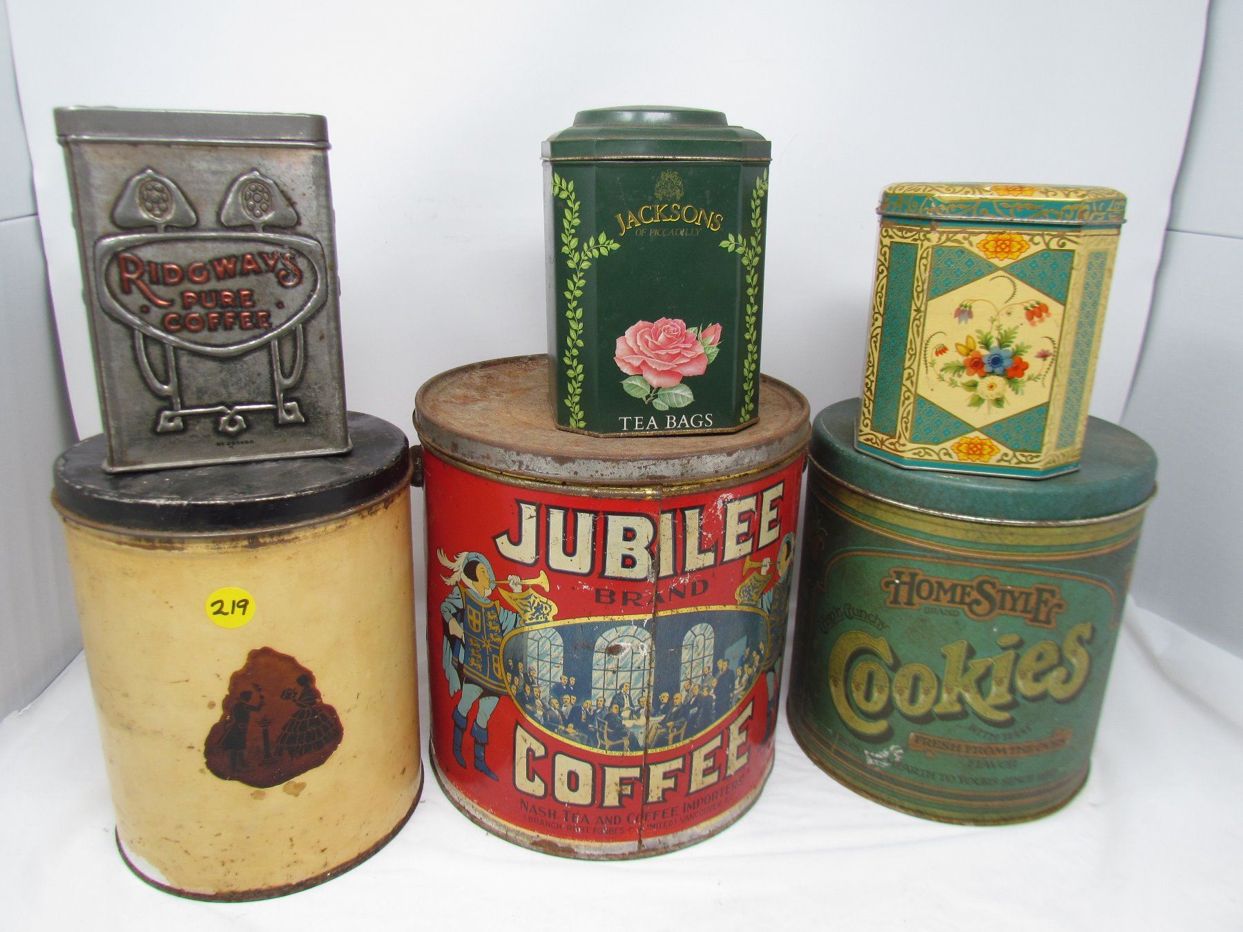 LOT OF 6 ASSORTED TINS (JACKSON, JUBILEE, HOME STYLE, ETC…)
