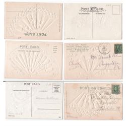 LOT OF 6 BEST WISHES AND RETURNS OF THE DAY FAN DECORATED POSTCARDS. One is gilt decorated and all are embossed. Two are marked on reverse "Series No. 351. Pub. By T.P. & Co., NY-Made in Germany" with one showing an illegible postmark. One is marked "Déposé-AOL" on reverse with a 1908 postmark. Three have no publisher mark or postmark.