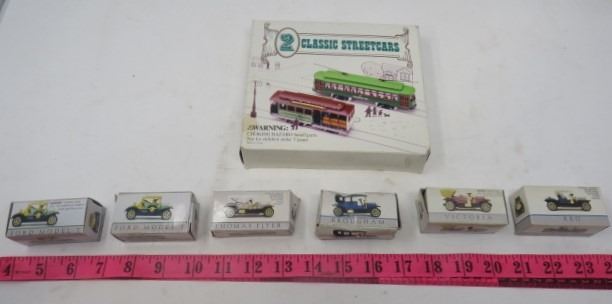 LOT OF 6 COLLECTOR CARS AND 2 STREETCARS (ALL IN BOXES) *MODEL T, VICTORIA, REO, ETC*