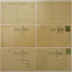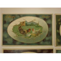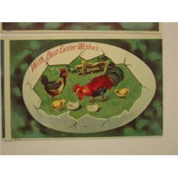 LOT OF 6 EASTER POSTCARDS FEATURING CHICKENS AND EGG DECORATION. One is gilt decorated. Four feature a circled A logo in lower left of reverse. Two are marked "Printed in Germany" on reverse with "Serie 746" printed in lower left of reverse. One is postmarked 1910 and the rest are not postmarked.