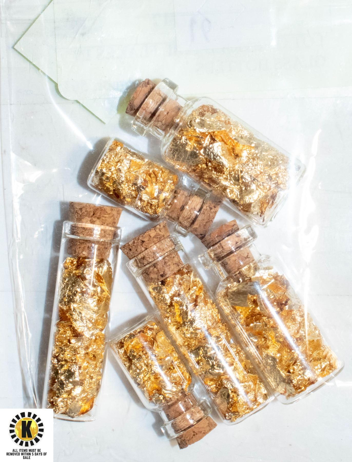 LOT OF 6 GOLD FOIL FLAKES IN GLASS BOTTLES