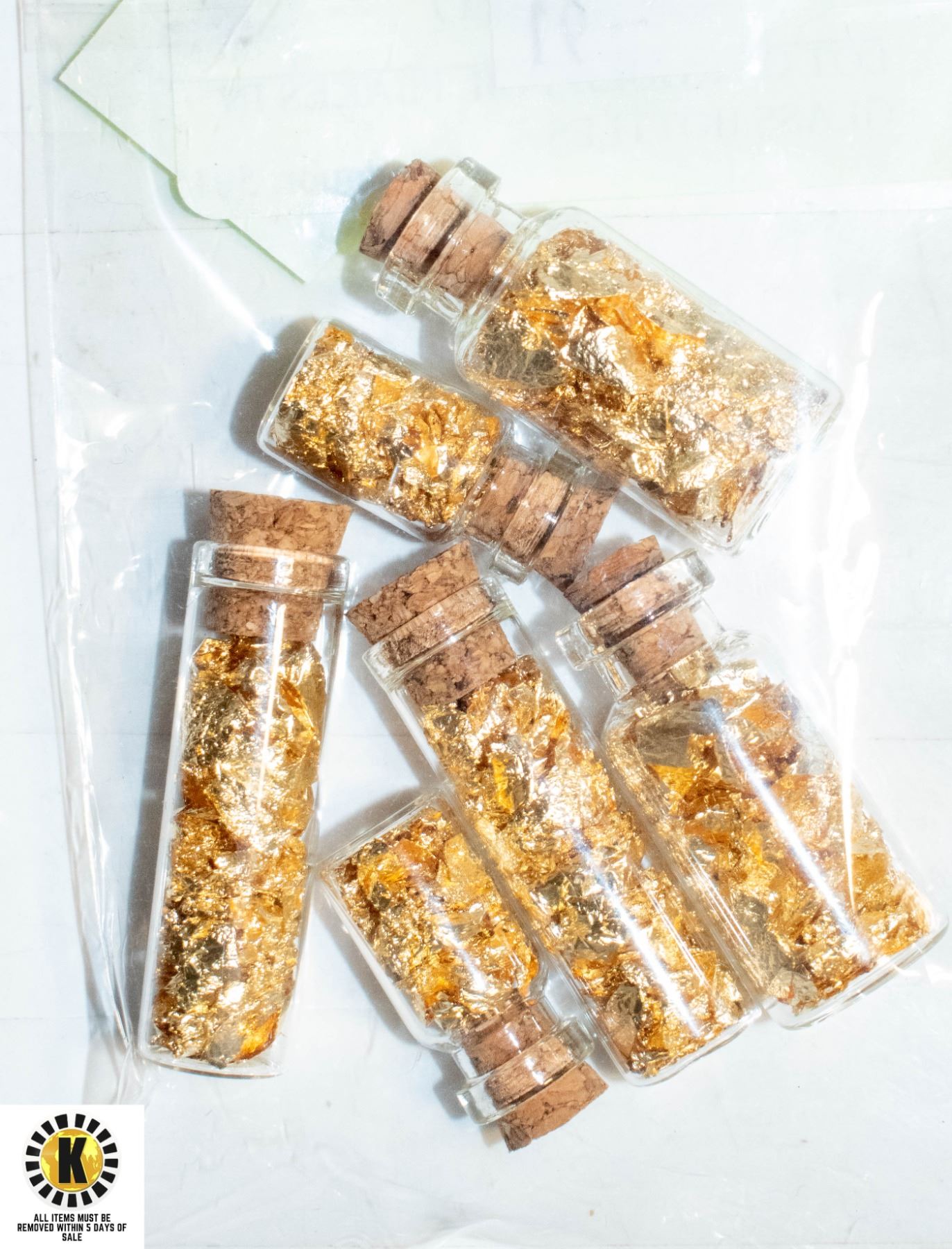 LOT OF 6 GOLD FOIL FLAKES IN GLASS BOTTLES
