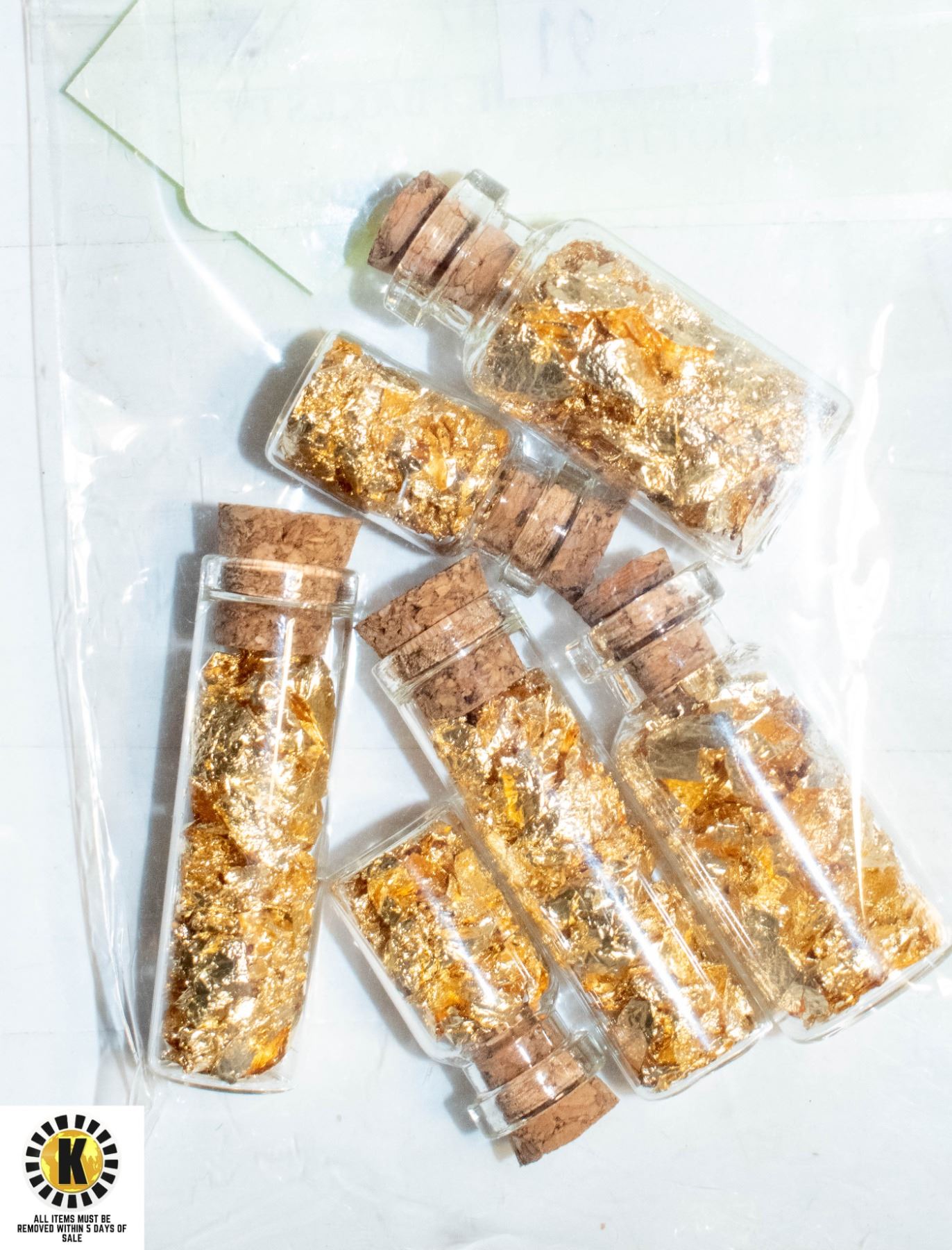 LOT OF 6 GOLD FOIL FLAKES IN GLASS BOTTLES