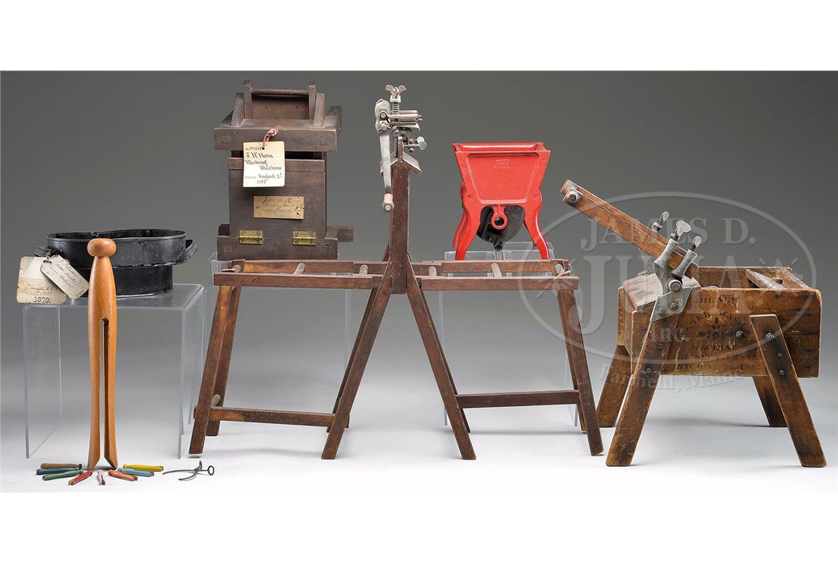 Lot includes a variety of washing machines and laundry related items highlighted by a patent model machine by J. W. Horn #193,957 dated August 7, 1877 (retaining original patent and receiving tags) consisting of an angled washtub and a sliding agitator. Also includes combination clothes wringer/drying rack, wooden wash tub with curved ribbed agitator, patent model tin washing tub by J. O'Brien with original patent and receiving tags (faded and illegible) and O. Rundle Gilbert tag indicating patent #2,657, wood and cast iron washtub and oversize clothespin. SIZE: Largest 17" l x 15" h x 11" w. CONDITION: Ranges from fair to very good. 1-13587