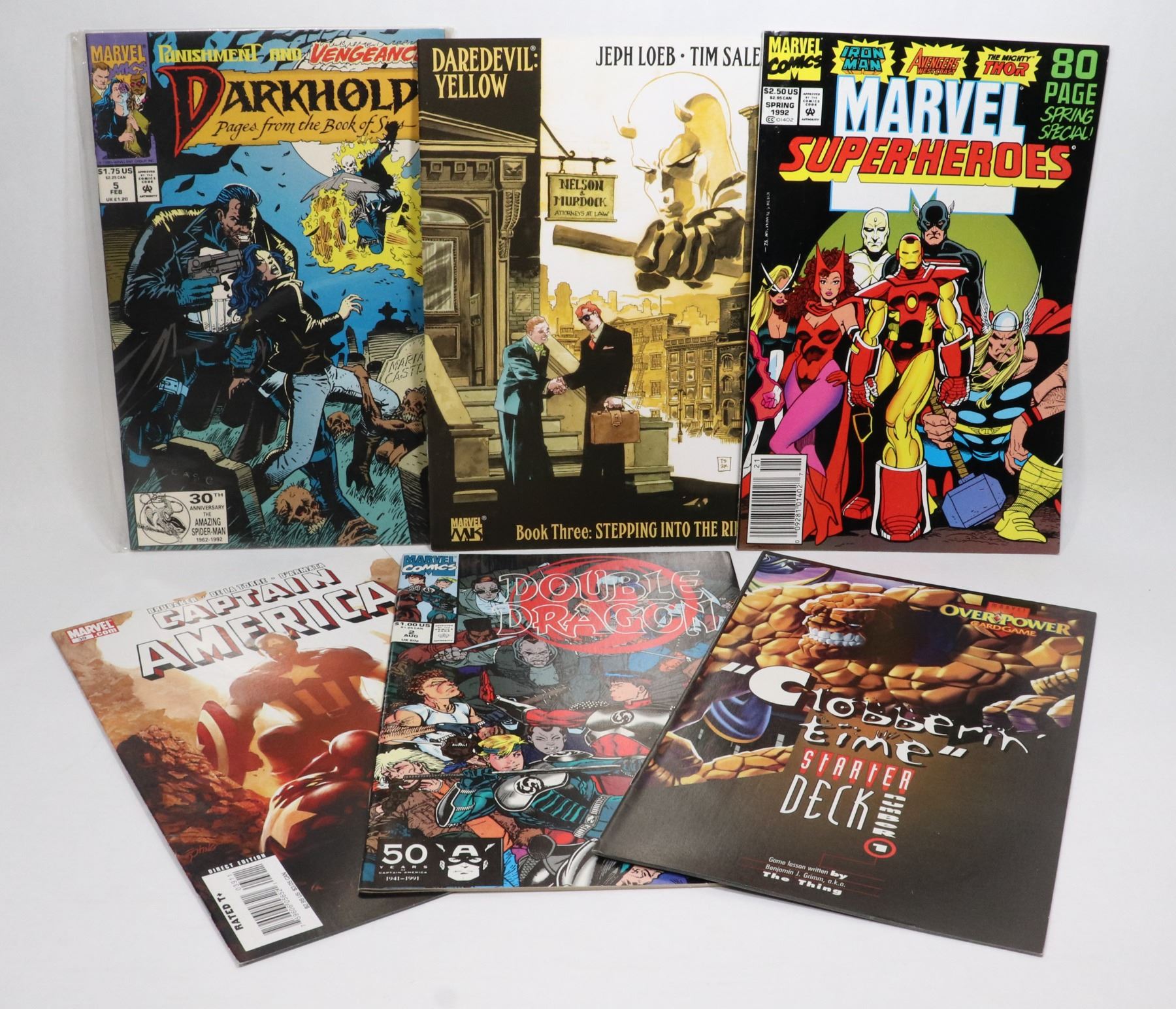 CAPTAIN AMERICA #39 MARVEL SUPERHEROES SPRING 1992 DOUBLE DRAGON #2 DARKHOLD #5 DAREDEVIL: YELLOW BOOK THREE CLOBBERIN TIME STARTER DECK #1***ITEM(S) LOCATED IN LETHBRIDGE ALBERTA. SMALL ITEMS ONLY ARE AVAILABLE FOR FREE TRANSPORT TO EDMONTON OFFICE (READ AUCTION DETAILS FOR MORE INFORMATION)