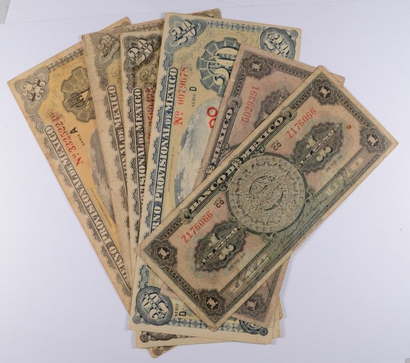 LOT OF 6 MEXICAN CURRENCY PROVISIONAL: (2) 20 PESO, 2 PESO, 1 PESO &