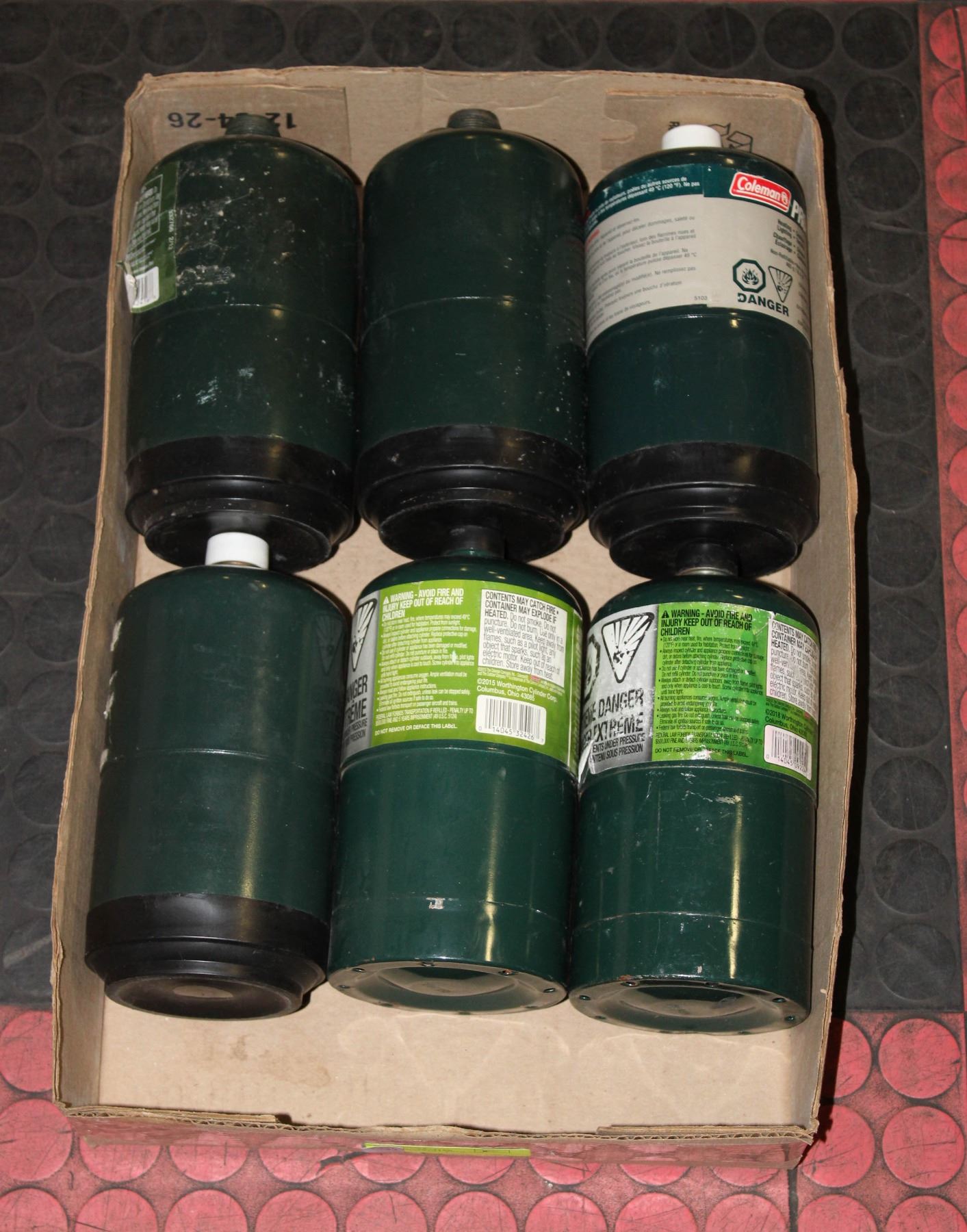 LOT OF 6 MINI FULL PROPANE BOTTLES