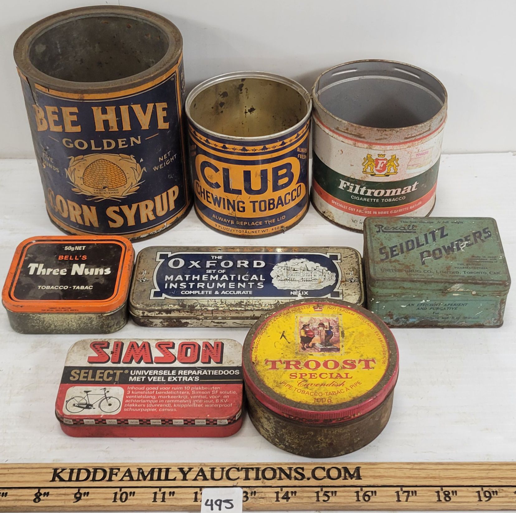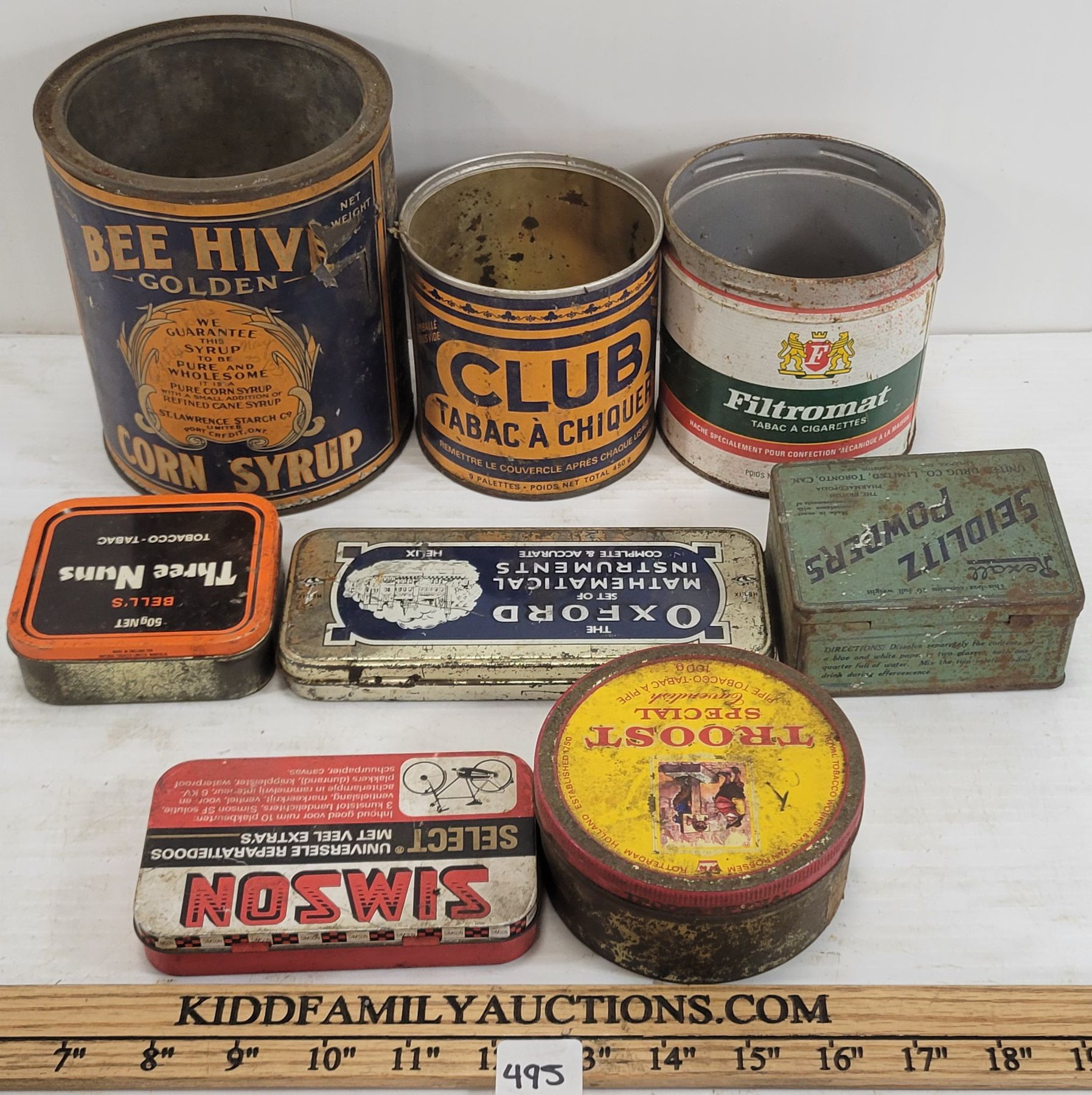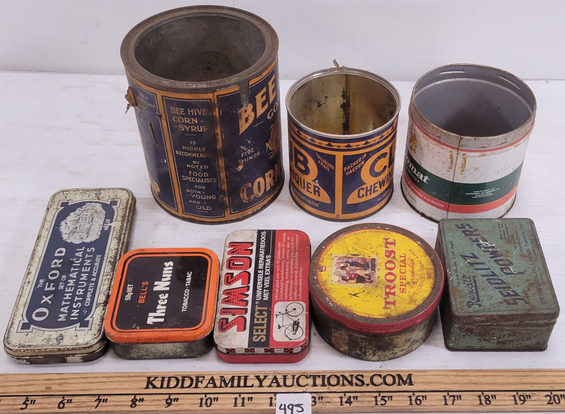 LOT OF 6 - MISC ADVERTISEMENT CANS - INCL TROOST TOBACCO & SIEDLITZ POWDERS, ETC.