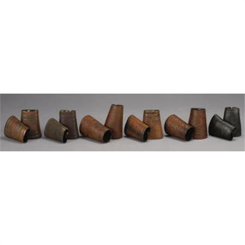 <B>LOT OF 6 PAIR OF LEATHER COWBOY CUFFS</B></I> - <BR> a) H.H. Heiser, Denver marked on snap; one brass snap missing; 6” tall; fair condition.<BR> b) Unmarked, line tooled, 6” tall; very dark, worn, stiff leather, poor condition overall.<BR> c) Unmarked, border stamped, 5¾” tall; Buckle straps missing.<BR> d) Unmarked, basket stamped, 5½” tall; one snap missing; fair condition.<BR> e) Unmarked floral tooled, laced with buckle closure; 6” tall; very good condition.<BR> f) Unmarked, 7½” tall; basket stamped; snap closures; well worn; laces missing<BR><BR><b>Shipping:</b> Miscellaneous Collectibles, Larg (<a target="_blank" href="http://www.heritageauctions.com/common/shipping.php">view shipping information</a>)