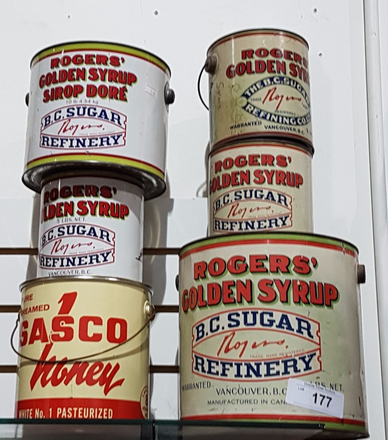 LOT OF 6 ROGERS SYRUP PAILS & HONEY PAIL