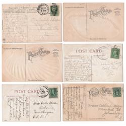 LOT OF 6 SHELL DECORATED POSTCARDS. Two are published by I. Stern, New York and are souvenir postcards from Waterford, NY (Postmarked 1908) and York, PA (No postmark). Two postcards are marked A & S on reverse and are similar with clam decorations and gilt decoration around face and are souvenir postcards from Findley Lake, NY (Postmarked illegibly) and Berlin Heights, OH (Postmarked 1908). One postcard has A. & S. logo on reverse and features gilt decorated conch shell on face (Postmarked illegibly). One postcard features shell on face and is a souvenir postcard from York Springs, PA (no postmark).