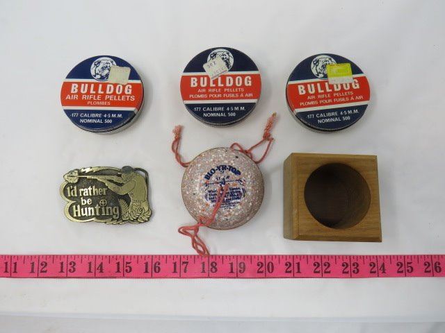 LOT OF 6 SMALL COLLECTIBLES (3 X TINS OF AIR PELLETS, BELTBUCKLE, SPINNING TOP, ETC…)