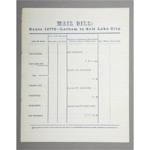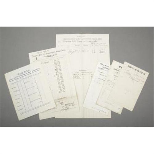 <B>LOT OF (6) STAGECOACH WAY BILLS, MONTANA, OREGON & UTAH CIRCA 1860-1900</B></I> This lot consists of (6) items, (2) California and Portland, Oregon Stage Way-Bills, 1860's, (3) Virginia City and Sappington Stage line, Way Bills, 1900's & (1) Latham to Salt Lake City, Mail (Way) Bill. <BR><BR><B>Condition:</B></I> All in very fine condition.<BR><BR><b>Shipping:</b> Flat Material, Small (<a target="_blank" href="http://www.heritageauctions.com/common/shipping.php">view shipping information</a>)