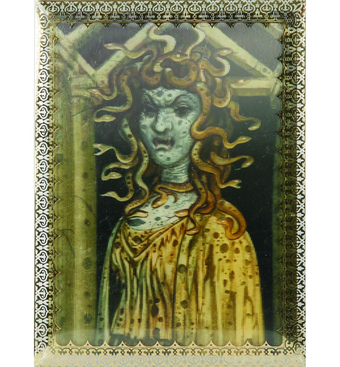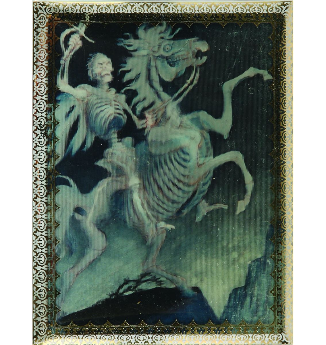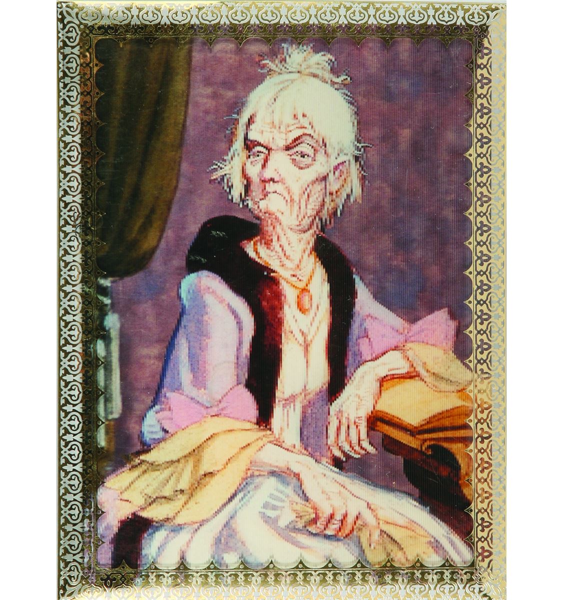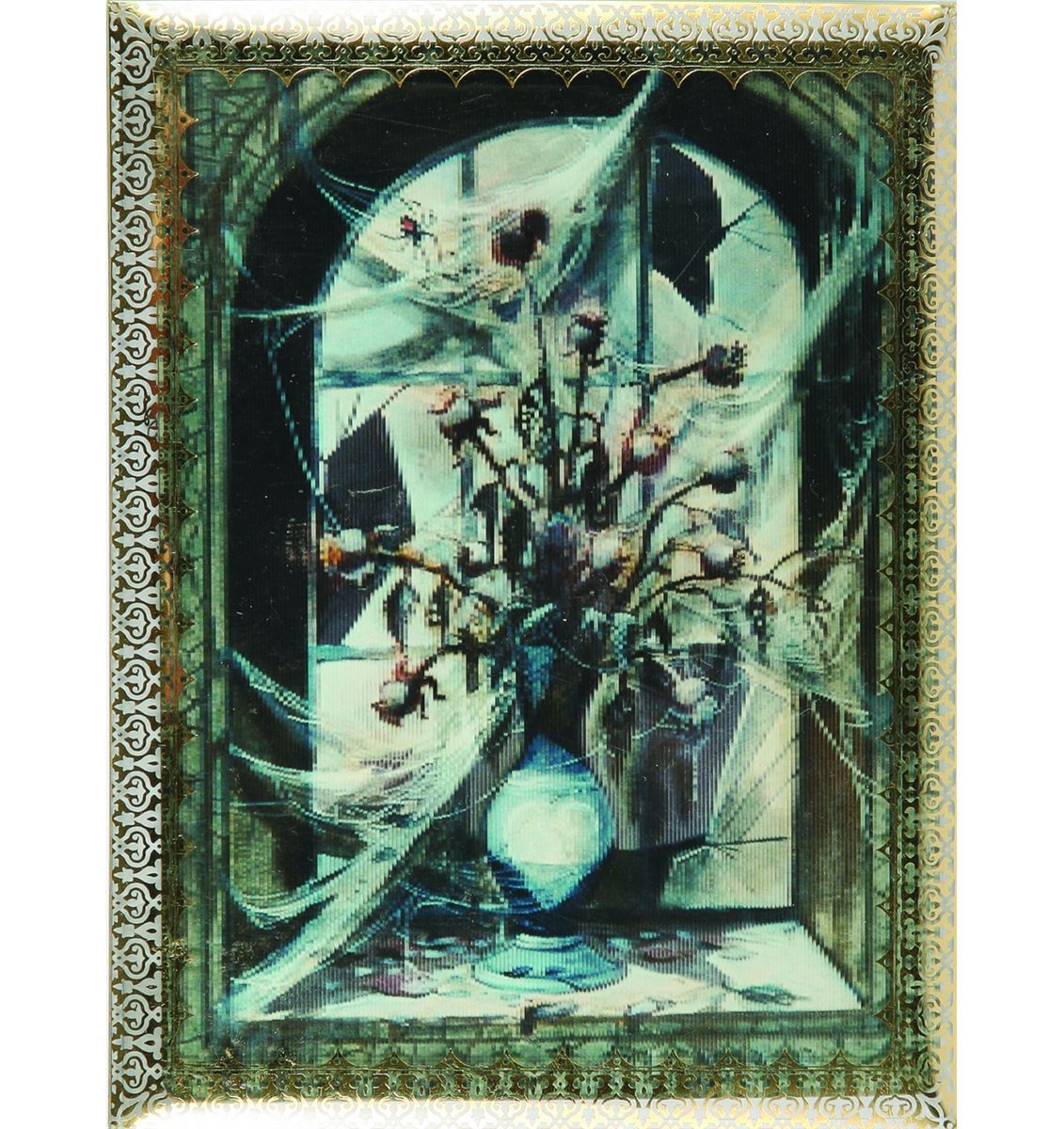 (Disneyland, 1999) This beautiful set of (6) lenticular cards feature spooky morphing imagery, similar to what park-goers would see in the Haunted Mansion attraction. This set of cards come in their original displayable packages and covers with a decorative gold border. This group of cards includes the original series of 5, plus an additional commemorative card without it’s cover. Cards measure 5”x3.75”. In good condition with minimal wear.