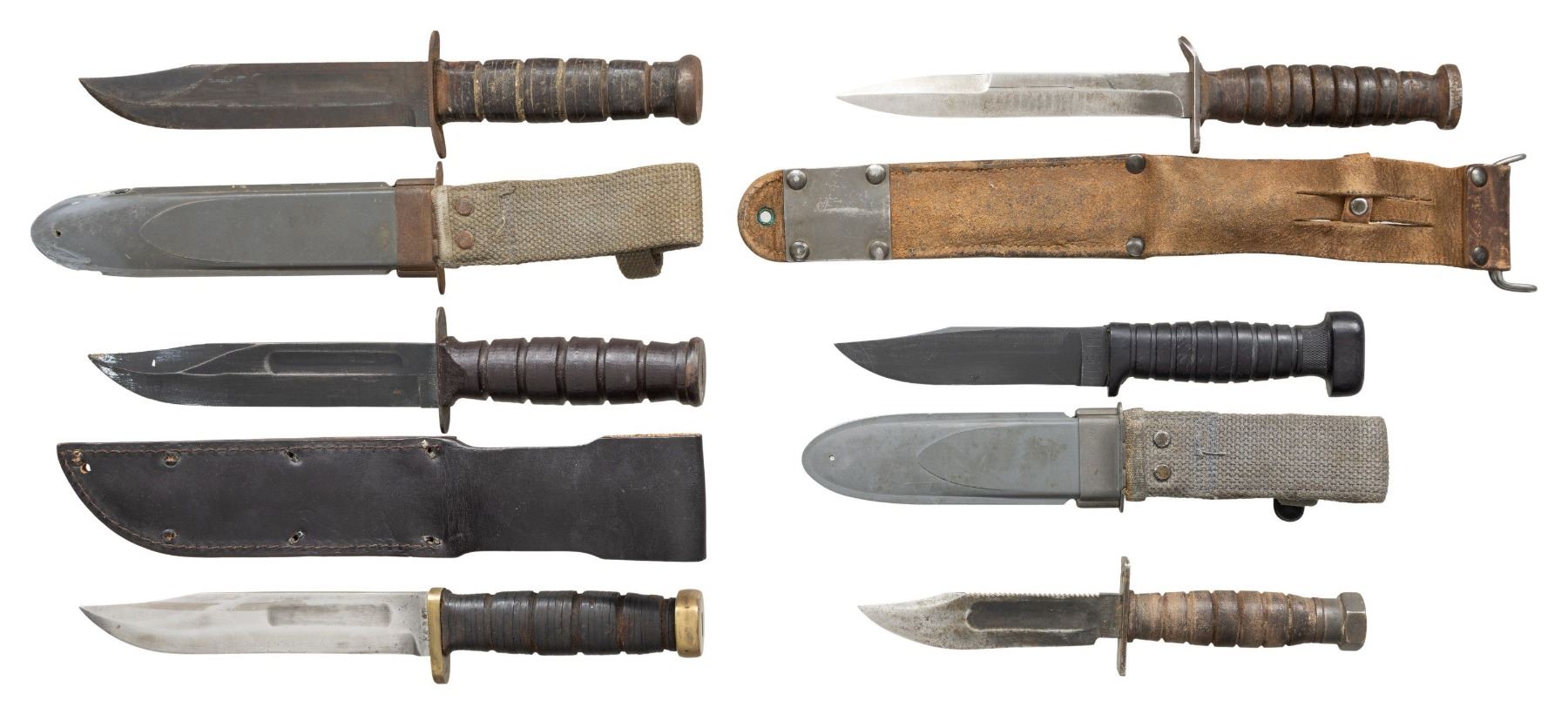 Lot of 6 U.S. fighting knives, including: 1) Camillus Air Force Survival knife. Blade measures 5" with an overall length of 9 7/16". Left side of the ricasso is marked "CAMILLUS/ NY". Clip point blade with serrated spine. Rectangular cross guard with 2-holes at rear and octagonal pommel. Grooved brown leather washer handle. CONDITION: blade shows areas of wear fading to gray patina, with scattered scratches overall. Guard and pommel show wear and light surface oxidation. Leather washer handle shows light crazing. 2) KA-BAR USMC fighting knife. Blade measures 7" with an overall length of 12 1/4". Left side of the ricasso is marked "KA-BAR", with "USMC" marked on the right. Blade has been cleaned and is in-the-white. Replacement brass guard and pommel. Grooved brown leather washer handle. CONDITION: blade retains a mostly bright appearance, exhibiting some spots of light to mild pitting and age related discoloration, some scratches, as well as striations from prior cleaning. Brass guard and pommel have acquired a pleasing patina. Leather washer handle shows some wear, handling marks, and separation of the washers, but otherwise remains sound. 3) KA-BAR USN MK2 fighting knife. Blade measures 7" with an overall length of 11 15/16". Left side of ricasso is marked "KA-BAR", with "USN MK2" marked on the right. Blade exhibits a reapplied blue finish. Flat steel guard with rnd. pommel. Grooved brown leather washer handle. UNATTACHED ACCESSORIES: gray synthetic USN MK2 sheath with gray canvas belt loop. CONDITION: blade retains large amounts of its reapplied blue finish, showing light to mild pitting, scattered areas of light to mild surface oxidation, as well as sharpening marks. Guard and pommel show wear, with consistent mild surface oxidation. Handle shows general wear, with some crazing and scattered handling marks. Sheath shows scattered handling marks, with consistent surface oxidation on steel throat. Sheath body shows a crack along the lower edge, with some chipping in corresponding area. 4) Camillus KA-BAR fighting knife. Blade measures 7" with an overall length of 12". Left side of ricasso is marked "U.S./ CAMILLUS". Blued blade, with parkerized guard and black enamel finished rnd. pommel. Brown painted grooved leather washer handle. UNATTACHED ACCESSORIES: unmarked black leather sheath. CONDITION: blade retains large amounts of its blue finish, showing mild edge wear, light surface oxidation, as well as some areas of white paint. Pommel shows scattered areas of flaking. Handle shows scattered handling marks, but is otherwise very good overall. Sheath remains malleable, showing light general wear. 5) Colonial U.S.N. Mark I fighting knife. Blade measures 5 3/16" with an overall length of 9 7/8". Left side of ricasso is marked "U.S.N." with "MARK I/ COLONIAL" marked on the right. Blade exhibits a dull black finish. 1-piece molded grooved black synthetic handle with flared pommel. UNATTACHED ACCESSORIES: UNATTACHED ACCESSORIES: gray synthetic sheath with "U.S.N./ MK.1" marked steel throat and gray canvas belt loop. CONDITION: blade is good, retaining the majority of its matte black finish, showing a few scratches and spots of light thinning. Handle shows a few scattered handling marks, but is otherwise sound. Sheath shows spots of discoloration and some handling marks, but is otherwise sound. 6) Utica M3 fighting knife. Blade measures 6 5/8" with an overall length of 11 1/2". Right side of blade is marked "U.S. M3-UTICA". Pommel is stamped with a U.S. flaming ordnance bomb proof. Grooved brown leather washer handle. UNATTACHED ACCESSORIES: M6 brown leather sheath with protective steel reinforcement plates towards toe. Front of sheath body is marked "U.S. M8/ MILSCO/ 1943". CONDITION: metal components retain trace to fair amounts of their original parkerized finish, with the balance exhibiting wear through to a gray patina, showing scattered scratches and spots of light surface oxidation. Leather washer handle shows scattered handling marks and spots of crazing, but is otherwise sound. Sheath remains malleable, showing scattered handling marks with light to mild crazing overall. Metal fittings show some spots of light to mild surface oxidation. (02-25321/MLW). NON-GUN. $200-400.