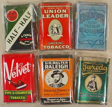 LOT OF 6 VINTAGE TOBACCO POCKET TINS - Incl. Union Leader, Tuxedo, Velvet, Sir Water Raleigh, Burley and Bright and Edgeworth.