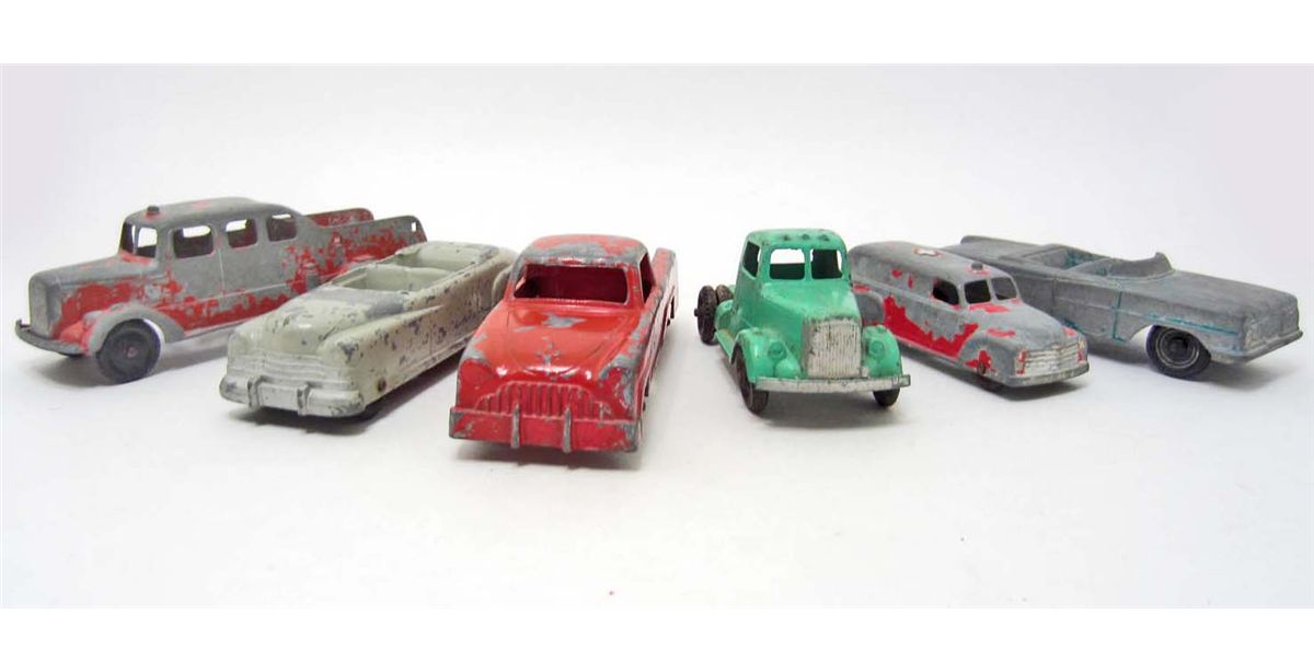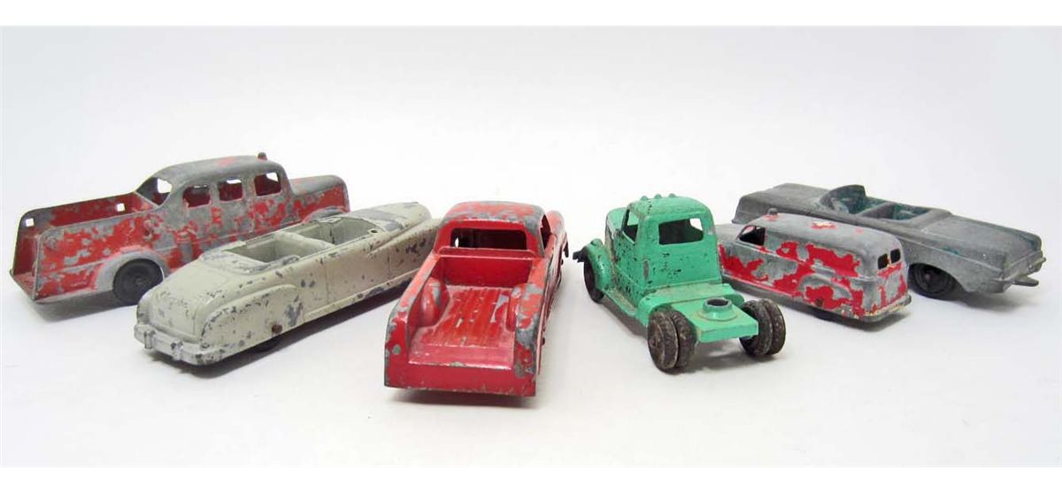 There are 2 cars, 3 trucks and an Ambulance. The biggest car is approx. 7" long .