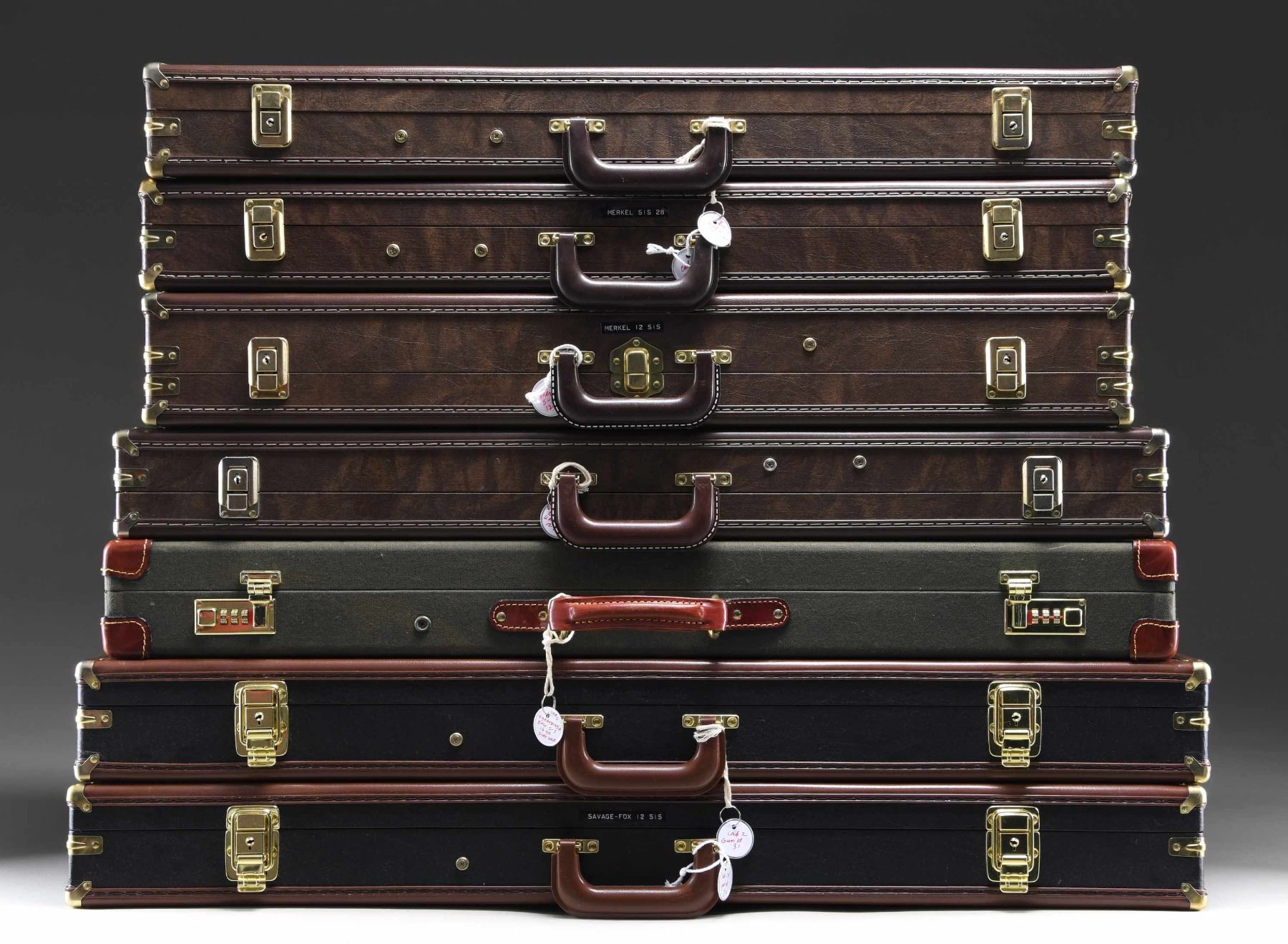 Lot of 7 assorted Browning hard cases, including: 1) 2 Browning black leather hard cases. 2) 4 Browning brown leather hard cases. 3) 1 Browning green canvas hard case. CONDITION: very good, with some wear and superficial marks from handling and storage. (02-23883/MLW). $300-600.