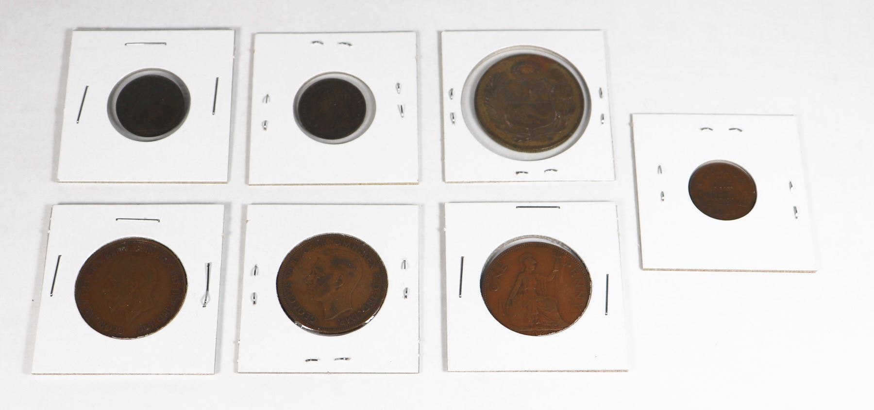 1902 FARTHING COIN, 3 BRITISH ONE PENNY 1936 1939 1945, PERU ONE SOL 1964 COIN AND CANADA ONE CENT 1928 COIN PENNY