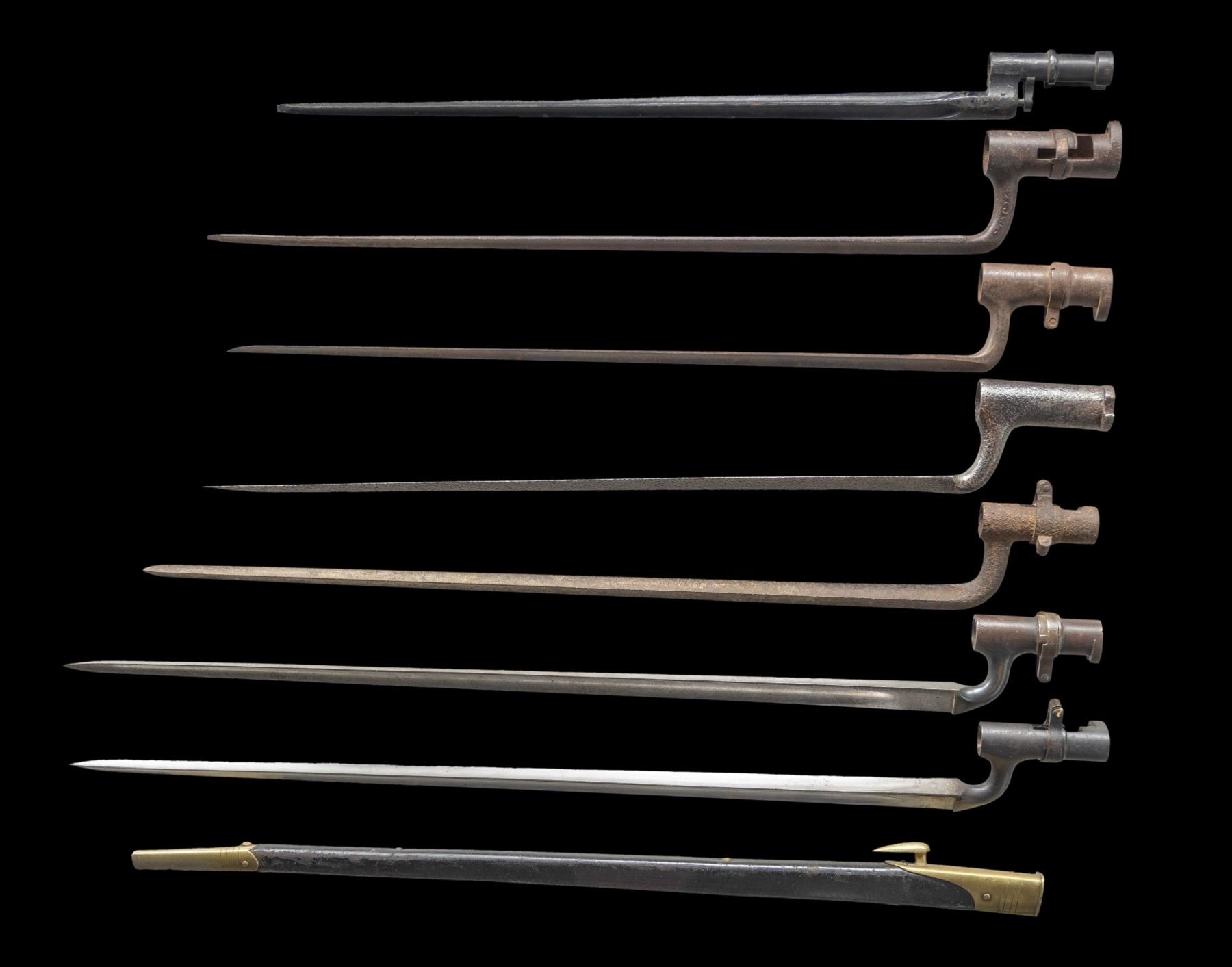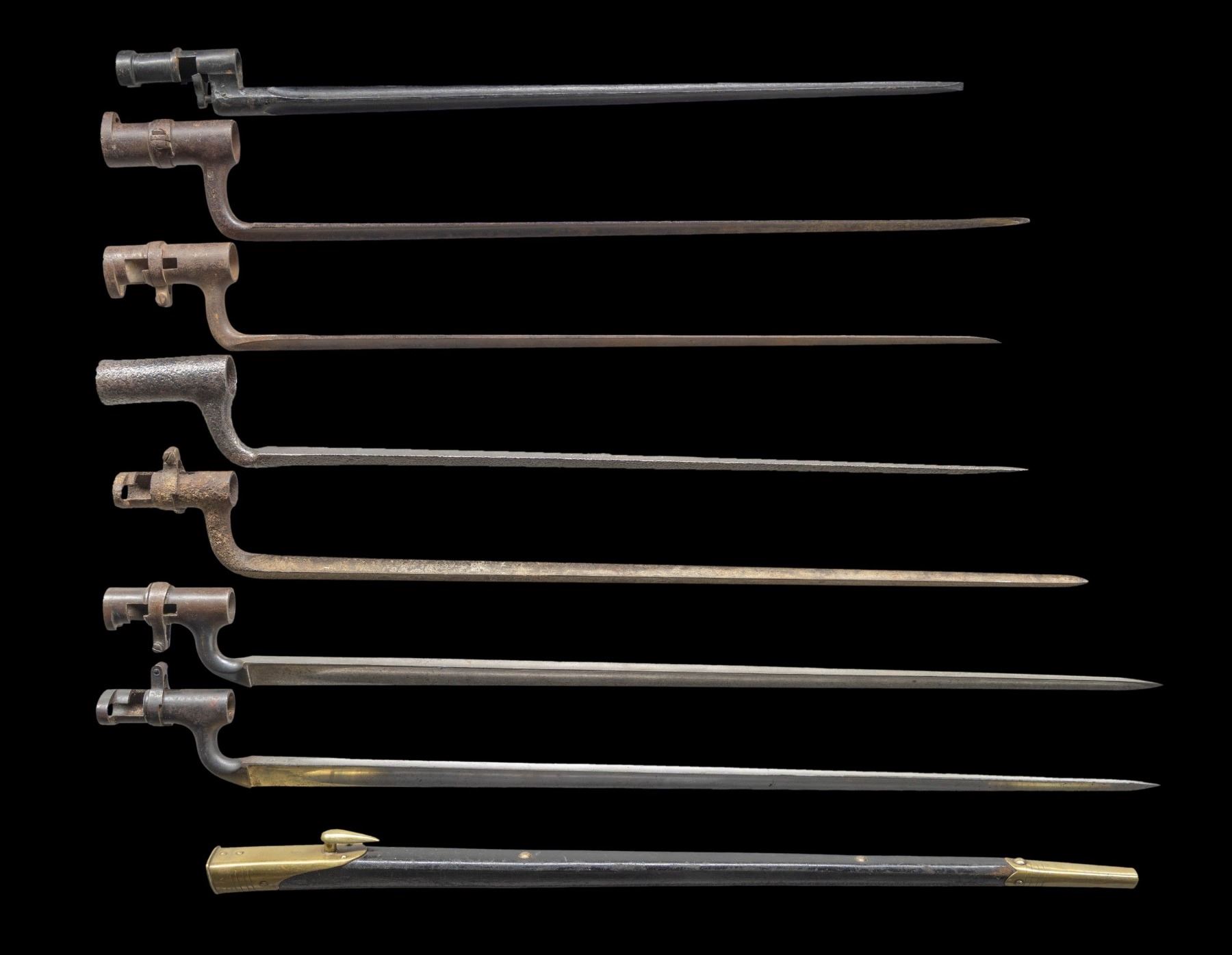 Lot of 7 assorted socket rifle bayonets, including: 1) British triangular socket bayonet. Blade measures 21 11/16" with an overall length of 25". Blade is polished in-the-white, with the socket being blued. British proofs are present on the top flat of the blade. UNATTACHED ACCESSORIES: British proofed black leather scabbard with brass fittings. 2) Unidentified socket bayonet. Blade measures 18 1/8" with an overall length of 21 1/2". Top flat of blade is stamped "12", with illegible numbers stamped on the left side of the elbow. CONDITION: bayonet retains traces of blue finish, with the balance exhibiting a mellow brown oxidized appearance. 3) British proofed triangular socket bayonet. Blade measures 21 5/8" with an overall length of 25". Blade is polished in-the-white, with the socket exhibiting a blue finish. Top flat of blade exhibits British proofs, with Arabic numerals present on the left flat. CONDITION: blade has faded to a gray patina, showing scattered spots of oxidation and age related discoloration. Socket retains fair amounts of bluing, with the balance fading to gray patina. 4) Unidentified socket bayonet. Blade measures approx. 20" with an overall length of approx. 22 5/8". CONDITION: bayonet exhibits a brown pitted and oxidized appearance overall. 5) Unidentified socket bayonet. Blade measures approx. 18" with an overall length of approx. of 20 7/8". No discernible markings or proofs are present. CONDITION: bayonet retains traces of its blue finish, with the balance exhibiting mild to moderate surface oxidation overall. 6) Unidentified triangular socket bayonet. Blade measures 18 1/8" with an overall length of 21 1/2". CONDITION: blade exhibits a cleaned dark gray pitted appearance overall. 7) Soviet M91/30 Mosin Nagant socket bayonet. Blade measures 16 15/16" with an overall length of 19 11/16". Blued finish. Left side is marked with the S#. CONDITION: good, with light wear and scattered spots of mild surface oxidation. (02-24132/MLW). NON-GUN. $300-400.