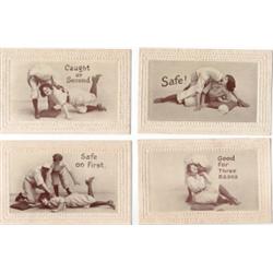 LOT OF 7 BASEBALL RELATED POSTCARDS featuring man and woman in baseball uniforms. All seven postcards feature baseball phrases with man and woman flirting. None are postmarked.