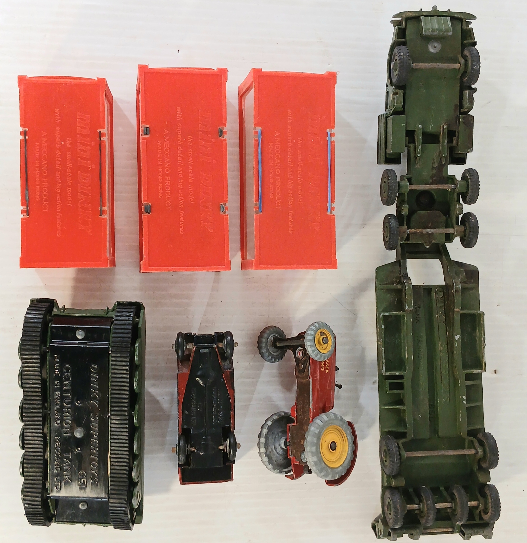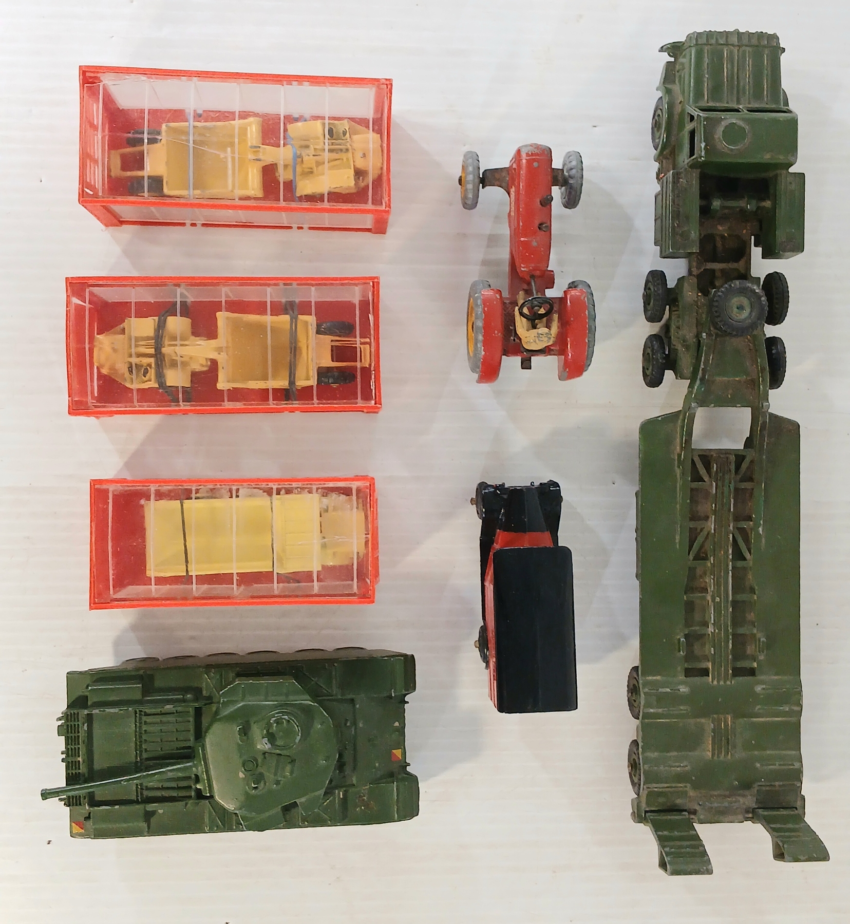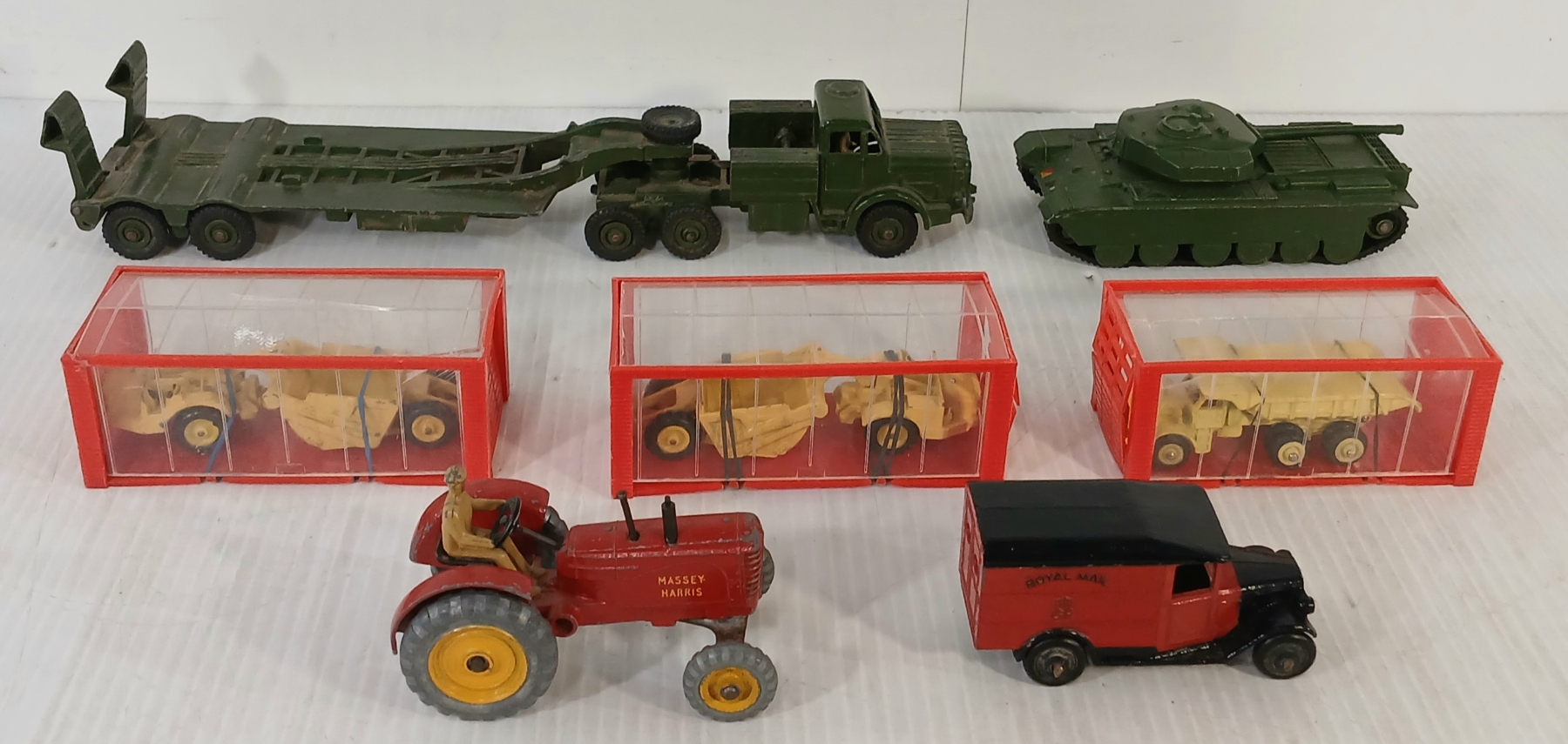 LOT OF 7 - DINKY TOYS DIECAST MODELS - CENTURION TANK, TANK TRANSPORTER, MASSEY HARRIS, ETC