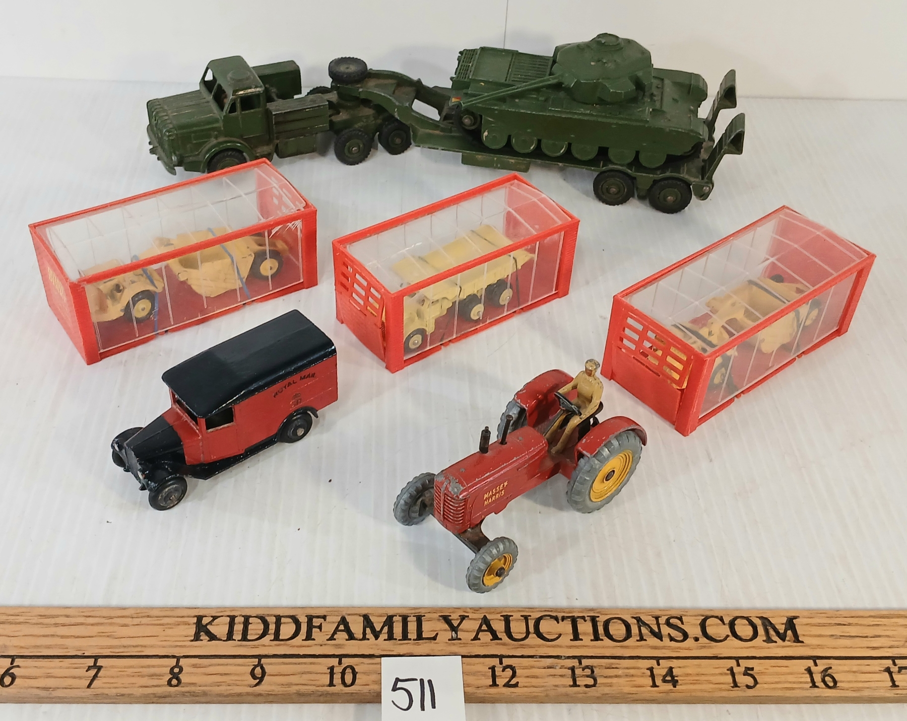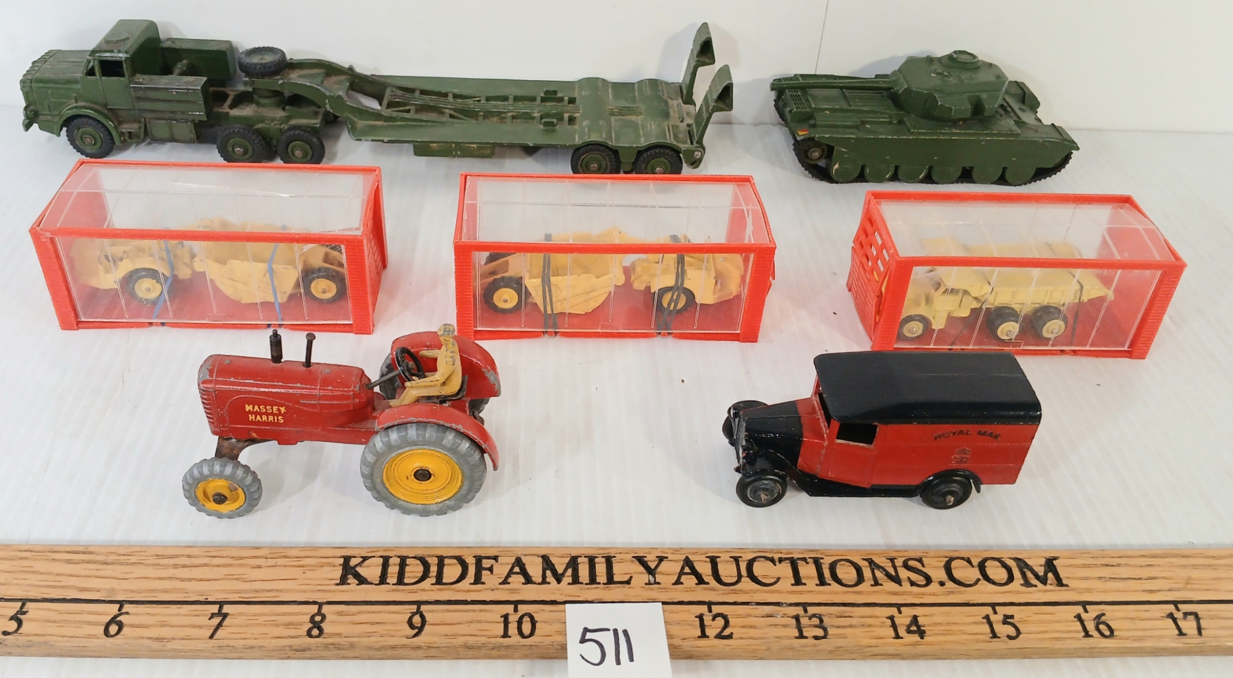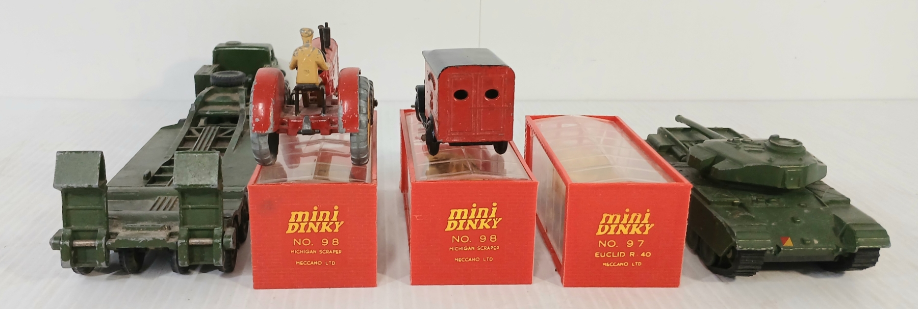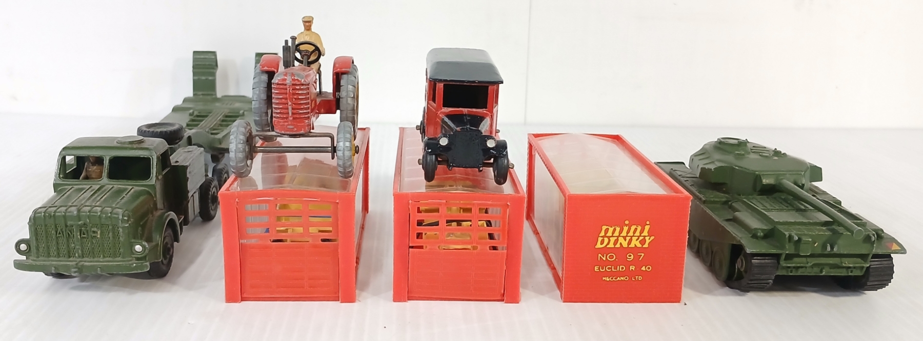 LOT OF 7 - DINKY TOYS DIECAST MODELS - CENTURION TANK, TANK TRANSPORTER, MASSEY HARRIS, ETC