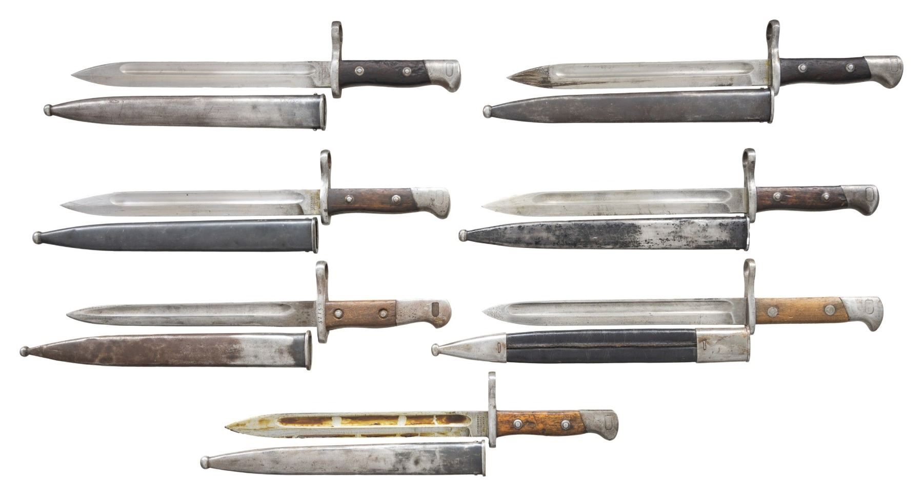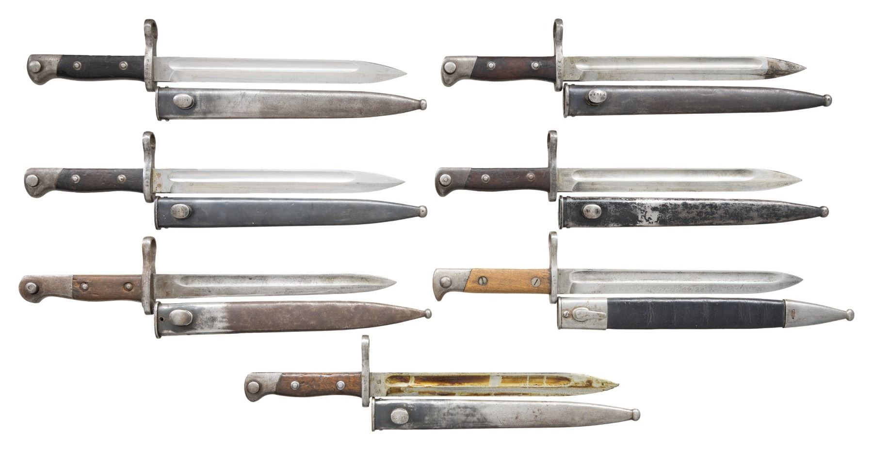 This lot consists of the following bayonets: 1) Five Chilean 1895 bayonets. Bayonets are German made by Weyersberg & have mismatch numbered scabbards. CONDITION: handles have mostly dark appearance with scattered dings, dents & stains. Metal parts of bayonets & scabbards show scattered oxidation, dings & dried grease. 2) Turkish M1913 Bayonet. Steel scabbard that is missing a screw. Blade has faint Ottoman markings. CONDITION: handles show chipping, heavy handling wear & dings. Metal is a mix of gray patina with, dings, oxidation, dents & edge wear. 3) Unknown Bayonet. Appears to be a Spanish 1893 with faint markings. Leather scabbard present. CONDITIOIN: metal parts appear cleaned with scattered oxidation, pitting, & dings. Grip panels appear sanded with dings & light chips. Leather scabbard shows crazing & staining. (02-24156/MJC). NON-GUN. $600-800 for lot.