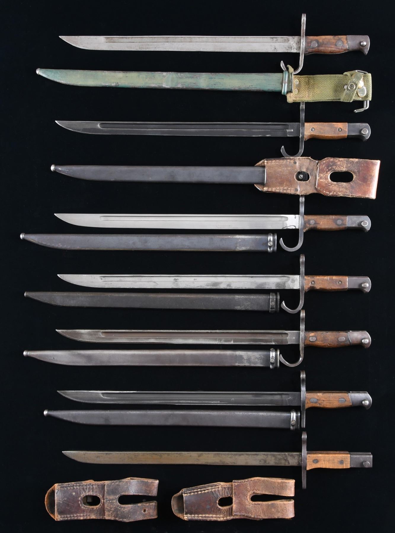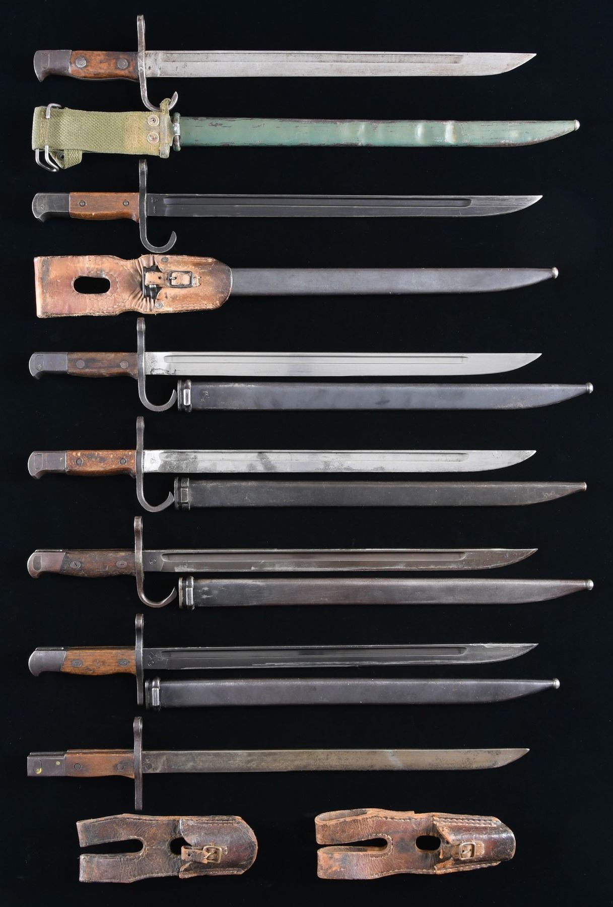 Lot of 7 Imperial Japanese Type 30 bayonets, including: 1) Type 30 Arisaka bayonet mfg. by Tokyo Arsenal. Right side of ricasso exhibits a Tokyo Arsenal insignia. Spine of grip is marked remnants of Kanji characters in white paint. Butt is numbered "32827". Blade is in-the-white, with the hooked quillon guard and pommel exhibiting a blue finish. 2-piece smooth wood grip scales. Complete with steel scabbard featuring a black painted finish. CONDITION: good, with the blade exhibiting scattered spots of light to mild pitting, as well as some areas of age related discoloration. Guard and pommel exhibit some wear, as well as some light to mild surface oxidation, with a small concentrated area of moderate oxidation present on the right side of the pommel. Scabbard is good overall. 2) Type 30 Arisaka bayonet mfg. by Toyoda Automatic Loom Works under Nagoya supervision. Right side of ricasso exhibits a Toyoda Automatic Loom Works insignia. Pommel is numbered "53260" on the butt. Blade, straight guard, and pommel exhibit a blue finish. 2-piece smooth wood grip scales. Complete with blued steel scabbard. CONDITION: very good, with the blade retaining the majority of its original blue finish, exhibiting some wear and thinning overall, as well as some oxidative etching and pin prick pitting on the right side towards the tip. Guard and pommel exhibit some light wear and spots of light surface oxidation. Grips show some scattered marks and impressions from handling and storage, but otherwise remain sturdy and serviceable. Scabbard is very good, with light to mild surface oxidation present overall. 3) Type 30 Arisaka bayonet mfg. by Nagoya. Right side of the ricasso is marked with the Nagoya arsenal insignia. Pommel appears to be numbered "37452" on the butt, with the first digit being poorly struck at the arsenal. Blade, hooked quillon guard, and pommel exhibit a blue finish overall. 2-piece smooth wood grip scales. Complete with a blued steel scabbard. CONDITION: blade retains the majority of its original blue finish, exhibiting areas of wear and thinning, some scattered spots of light to mild surface oxidation, as well as some scattered spots of age related discoloration. Guard and pommel exhibit areas of wear and thinning that show through to gray patina. Grips show some scattered marks and impressions from handling and storage, but otherwise remain sturdy and serviceable. Scabbard shows areas of wear and thinning, as well as areas of light to mild surface oxidation and pitting overall. 4) Type 30 Arisaka bayonet mfg. by an unknown mfg. under Kokura supervision. Right side of the ricasso is marked with the Kokura arsenal insignia, followed by an unidentified mfg. marking. Pommel is numbered "103360" on the butt. Blade is polished in-the-white, with the hooked quillon and pommel exhibiting a blue finish overall. 2-piece smooth wood grip scales. Complete with a blued steel scabbard. CONDITION: blade is very good, exhibiting some spots of age related discoloration, as well as a few areas of oxidative etching. Guard and pommel exhibit some wear and thinning, as well as areas of light to mild surface oxidation. Grips show scattered marks and minor impressions from handling and storage, but otherwise remain sturdy and serviceable. Scabbard shows some areas of wear and thinning, with scattered spots of light to mild surface oxidation overall. 5) Type 30 Arisaka bayonet produced by an unknown mfg. Right side of the ricasso is blank, with no legible markings present on the butt of the pommel. Blade is in-the-white. Hooked quillon. 2-piece smooth wood grip scales. Complete with a green painted steel scabbard, fitted with a U.S. OD canvas web frog. CONDITION: blade exhibits scattered spots of mild pitting, with age related discoloration and sharpening marks present overall. Guard exhibits a gray patina, with areas of darker patina and pitting present overall. Pommel exhibits a dark gray patina. Scabbard exhibits flaking and wear to its painted finish, with scattered dents and impressions. 6) Type 30 Arisaka bayonet mfg. by National Denki (National Electric) under Kokura supervision. Right side of the ricasso is marked with the National Denki arsenal insignia. Pommel is marked "02016" on the butt. Blade, hooked quillon, and pommel exhibiting a black enamel type finish. 2-piece smooth wood grip scales. Complete with a blued steel scabbard and original brown leather frog. CONDITION: very good, with metal components retaining the majority of their original black enamel type finish, exhibiting some light wear and thinning overall. Grips show a few superficial marks and minor impressions from handling and storage, but otherwise remain sturdy and serviceable. Scabbard is very good, exhibiting some light to mild surface oxidation overall. Leather frog remains malleable, exhibiting wear, some age related cracking, as well as areas of crazing overall. 7) "Last Ditch" Type 30 Arisaka bayonet mfg. by Toyoda Loom Works under Nagoya supervision. Right side of the ricasso exhibits Toyoda's arsenal insignia. Number on butt is mostly illegible. Standard "Last Ditch" pattern blade, without blood groove. Straight guard and pommel exhibit a blue finish. 2-piece smooth wood grip scales. CONDITION: blade retains a mostly brown patina, exhibiting light to mild pitting overall, with scattered spots of age related discoloration. Guard and pommel exhibit scattered spots of light to mild surface oxidation. Grips show some superficial marks from handling and storage, but otherwise remain sturdy and serviceable. 8) 2 brown leather Type 30 Arisaka frogs. CONDITION: frogs remain malleable, exhibiting areas of age related cracking and crazing overall. Retention strap is torn on both frogs, with 1 exhibiting losses to the stitching on the rear. (02-23947-1/MLW). $500-1,000.