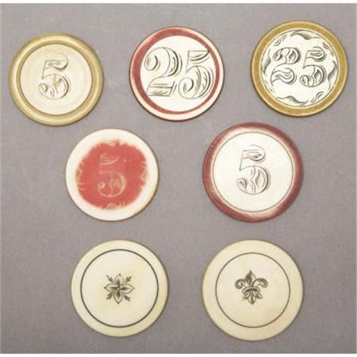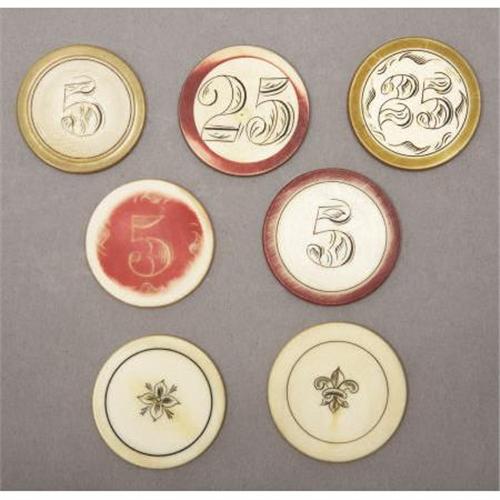 <B>LOT OF 7 IVORY GAMING CHIPS CIRCA LATE 19TH CENTURY</B></I> - <BR> a) Fleur de lis design, some slight yellowing<BR> b) “25” with red edge, color wear, no cracking<BR> c) “5” natural with tan edge, soiling<BR> d) “5” red body with leaf design, heavy edgewear<BR> e) Central floral design, slight yellowing<BR> f) “5” with red edge, color wear<BR> g) Ornate “25” with brown edge, some color wear<BR><BR><b>Shipping:</b> Miscellaneous Collectibles, Smal (<a target="_blank" href="http://www.heritageauctions.com/common/shipping.php">view shipping information</a>)