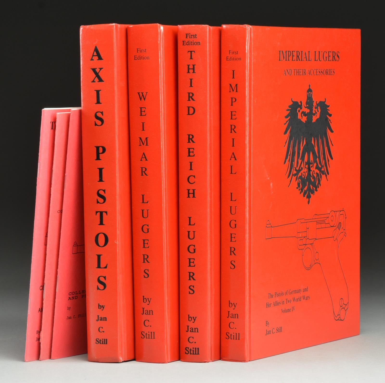 This lot consists of 7 Jan Still German pistol books, three are softcover & four are hardcover. The three softcover titles are Axis Pistol Collecting And Price Guide 1986-1987, Weimar and Early Nazi Lugers and Their Accessories & Third Reich Lugers And Their Accessories. The four hardcover titles are Axis Pistols, a first edition Weimar Lugers, first edition Third Reich Lugers & first edition Imperial Lugers. Three of these hardcover books are signed by the author. (02-16954-1/MJC). $300-500.
