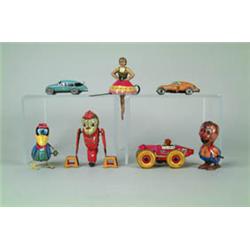 Lot # 1052 LOT OF 7 MARX MECH. TOYS. 1) Performing ballerina. 2) Somersaulting monkey porter. 3) Midget race car. 4) & 5) Two w/up racers. Color variation. 6) Hopping squirrel. Japan. 7) Hopping crow. Japan. SIZE: Largest is 6" h. CONDITION: Averaging good to very good and working. 1-29441 (200-300)