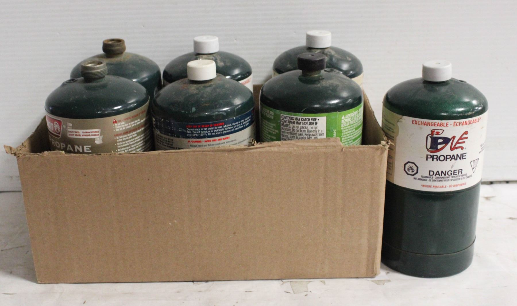 LOT OF 7 MINI GREEN PROPANE TANKS (FULL)