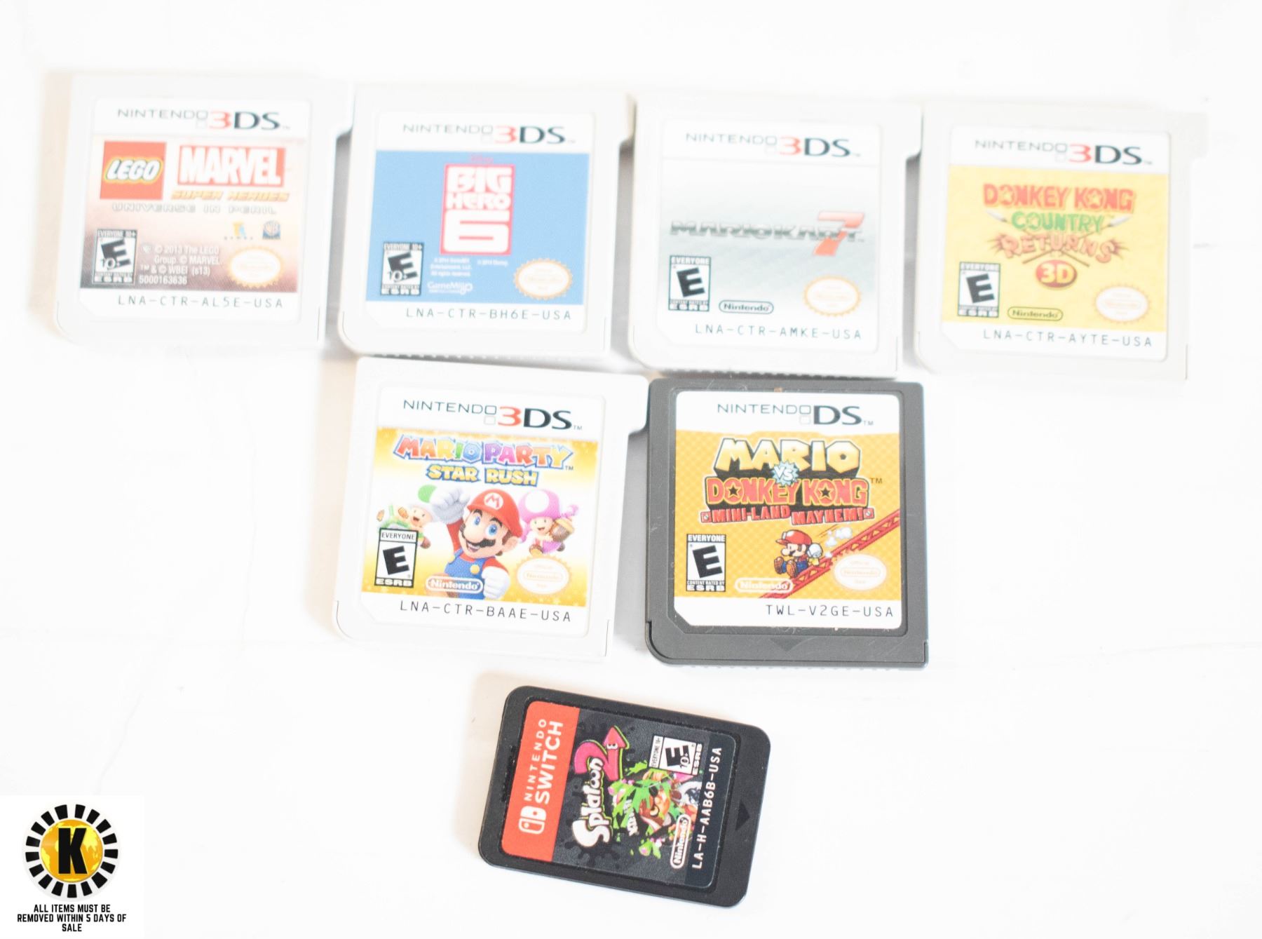 3DS: MARIOPARTY, DONKEY KONG COUNTRY RETURNS, MARIOKART 7, BIG HERO 6, MARVEL SUPER HEROS. DS: MARIO VS DONKEY KONG. SWITCH: SPLATOON 2