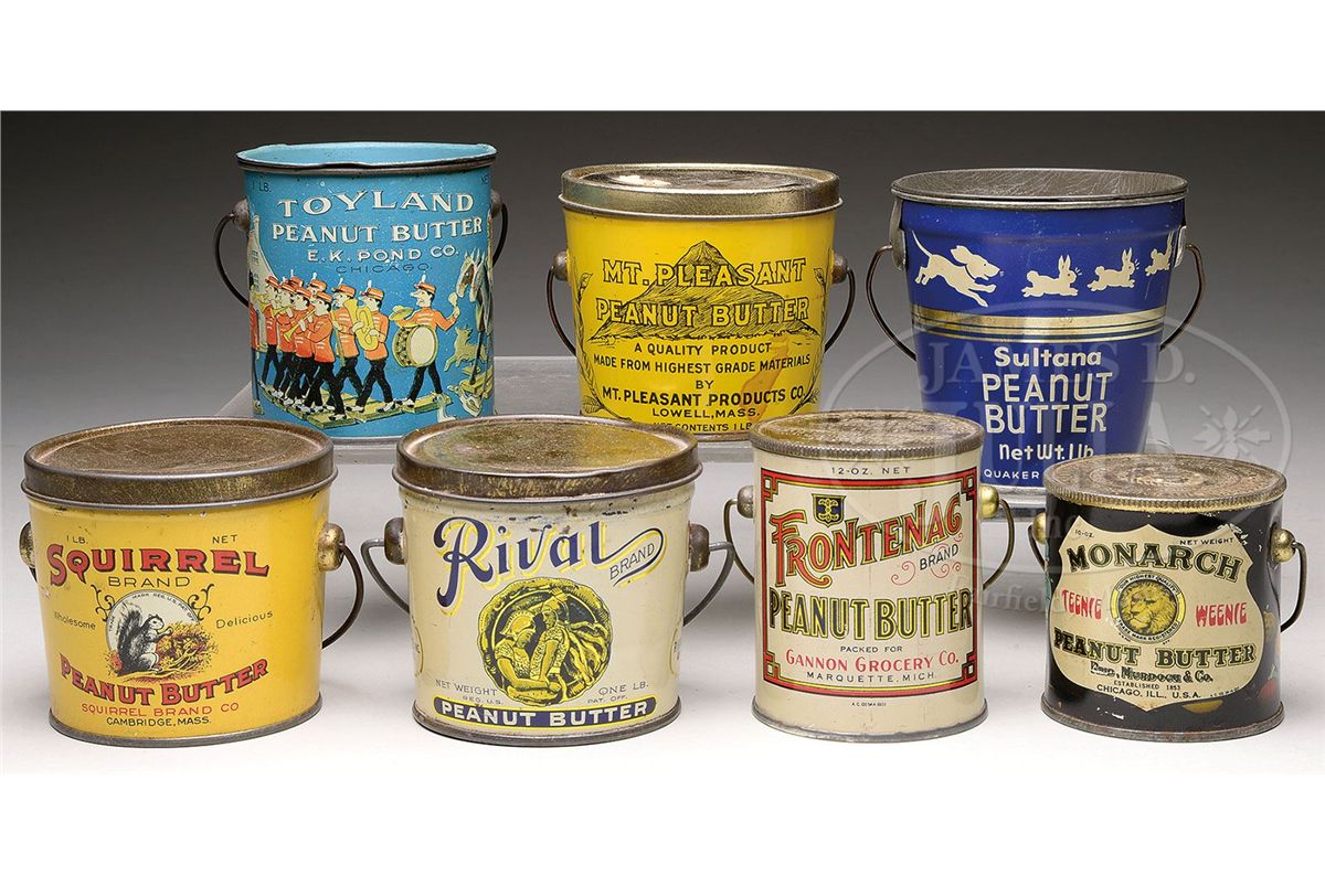Mostly 1 lb tins including 1) Toyland; 2) Mt. Pleasant; 3) Sultana; 4)Squirrel Brand; 5) Frontenac (12 oz); 6) Monarch Teenie Weenie (10 oz); 7) Rival. SIZE: 1) 3-3/4"; 2) 3-1/2"; 3) 4"; 4) 3-1/2"; 5) 3-3/4"; 6) 3"; 7) 3-1/2". CONDITION: Overall good to very good with original wire bales. Various chips, scratches and oxidation. 1-13226-31