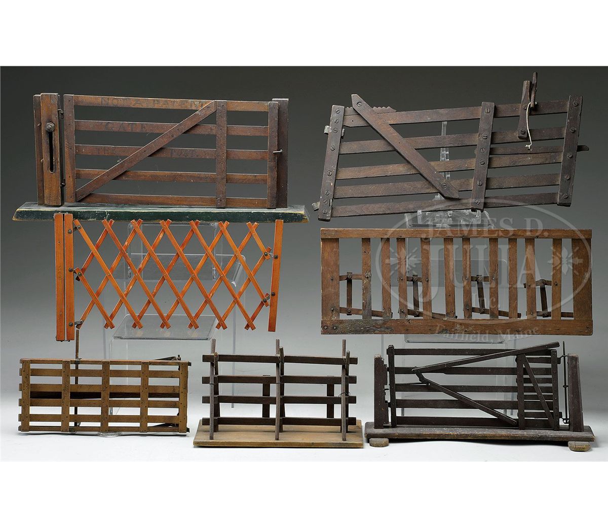 Variety of wooden slat gates highlighted by a farm gate stamped "Excelsior Gate Post". All exhibiting fascinating operational mechanics. SIZE: Largest 21" l x 11" h. CONDITION: Lot averages good with original surfaces. 1-13548