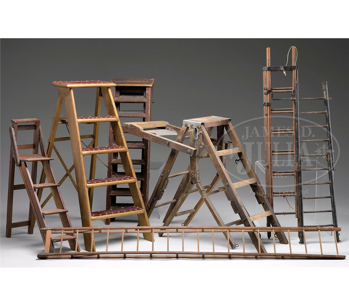Lot consists of various step and extension ladders of differing designs including and unusual rack and pinion extension ladder. All are wood with metal hardware and are unmarked. SIZE: Largest 40-1/2" h. Smallest 23" h. CONDITION: Overall lot is good to very good with various chips, scratches and oxidation to metal hardware. 1-13598