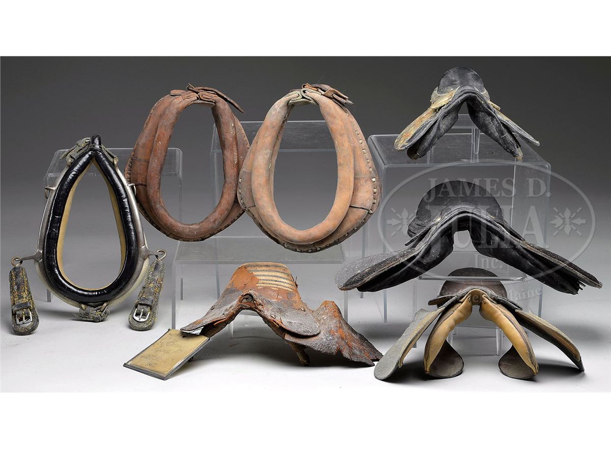 Stitched leather collars and English style saddles in a variety of styles. Included is a patent model saddle by J. Curry # 63864 dated April 16, 1867 retaining original patent tag. SIZE: Largest 12" l x 14-1/2" w. CONDITION: Collars are generally very good. Two of the saddles are deteriorated. All show evidence of mildew. 1-13551