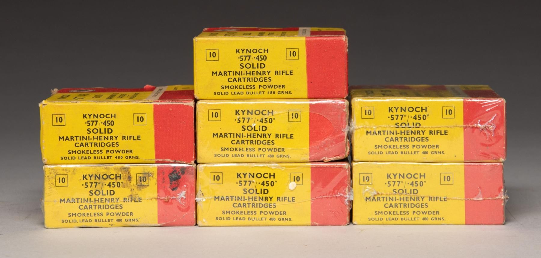 MARTINI-HENRY AMMUNITION. Lot of 70-rds. (7 10-rd. boxes) of Kynoch .577"/.450", 480 grain, Solid Lead Bullet Martini-Henry ammunition. 5 boxes are non-factory plastic sealed, with 2 boxes having been opened. CONDITION: examined ammunition is good, showing corrosion on lead projectiles, with patina on brass cases. Sealed boxes are very good, with a few exhibiting a hole to the plastic packaging. 1 opened box is good, with the other being fair. (02-24542-3/MLW). AMMO. $400-600.