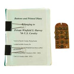 LOT OF 7TH CAVALRY UNIFORM BUTTONS AND TYPED TRANSCRIPT OF DIARY. This lot consists of fifteen early spread winged eagle buttons, four large and eleven small. Each eagle has a shield on its breast with a large "C", except on of the small buttons, which has a standard shield decorated with red paint.. The backs have a wire loop and are marked Waterbury Button Company. They are mounted to a thin wooden board covered with old paper with an old ink notation at the top "W.S. Harvey / 7th U.S. Cavalry Buttons". The back has a small paper tag with type written notation "Worn by / Winfield S. Harvey, 1866-1871". According to the preface of his diary, Harvey was born in Fayett County PA and was named for Gen Winfield Scott. He served in the 57th PA Volunteers. After he war, he enlisted as a farrier in the 7th Cavalry, Co. K and was discharged as a sergeant 9/11/71. The following is an excerpt from Harvey’s diary, recounting a day under Custer’s command and the destruction by the 7th Cavalry of a friendly Cheyenne village led by Black Kettle, who had camped on the Washita under Gen. William Hazen’s promise of protection: “November 27, 1868. The morning is very cold. We found them at last. We charged at daybreak. Captured the entire Indian village, numbering fifty-two lodges, and killed 103 of their warriors, including their principal chief Black Kettle. Captured 57 or 75 of their women and children who are in our possession, prisoners of war…” The entry goes on to list wounded, etc and mentions that the 7th killed about 800 of the Cheyenne’s ponies and mules - a tremendous loss to any surviving Cheyenne with winter coming on. Harvey’s diary is a very plain unvarnished account of a trooper’s life during the campaigns against the plains Indians. Although he wrote with a degree of admiration about some of the “friendly” Indians that he had contact with, this attitude is belied somewhat by his account of 12/20/68 regarding how the army is holding two Kiowa chiefs (Satanta and Lone Wolf) hostage to induce their people to surrender “for the good of their tribes”. After the very recent slaughter of their friend Black Kettle (one of the most peaceable of the Cheyenne) and his family and followers, however, it is difficult to imagine how these chiefs could trust their families’ lives to the good intentions of the Army. This diary is a wonderful source of information for any student of the Indian Wars. CONDITION: Buttons all retain about half their original polish with some oxidation, primarily on the eagle. Backing board is cracked down the center and the paper is very old and brittle, soiled and stained. One button appears to be missing as there apparently were sixteen to begin with. Typewritten diary transcript is in very good condition. 4-53320